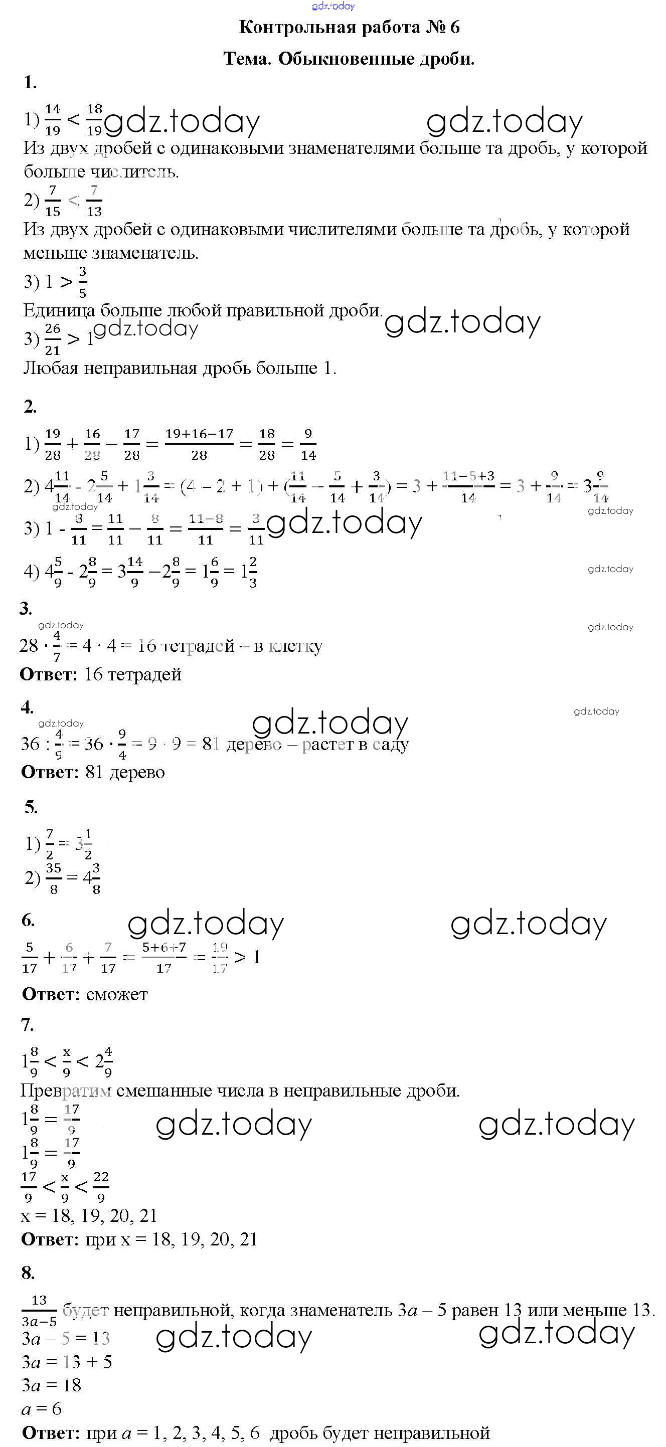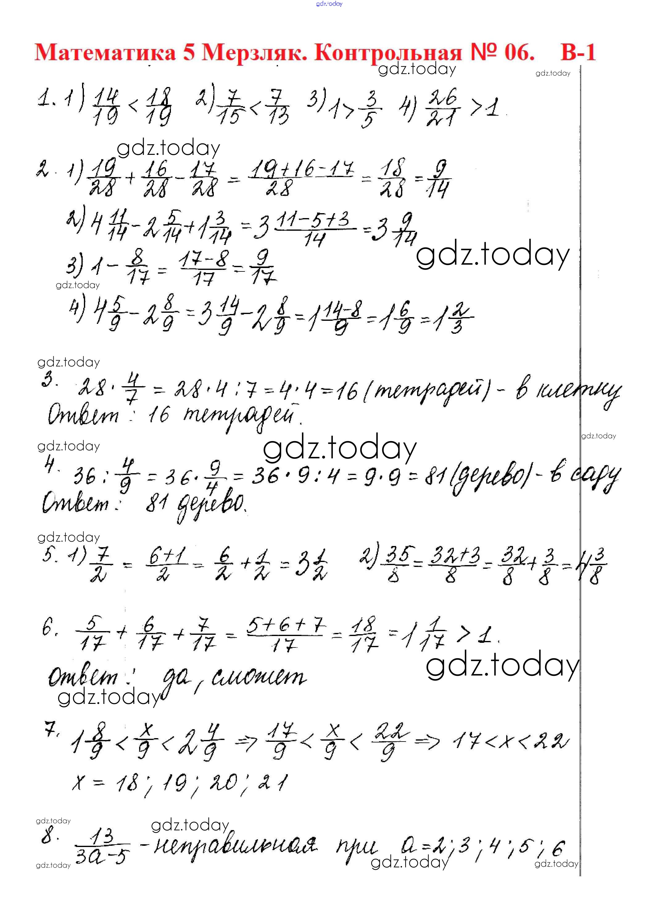 Ответы к КР №6. Обыкновенные дроби Решение к контрольные работам вариант 1 Дидактическим материалам по Математике для 5 класса Мерзляк, Полонский Вентана-граф Алгоритм успеха 2017
