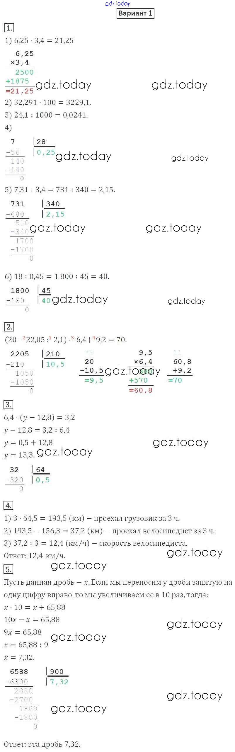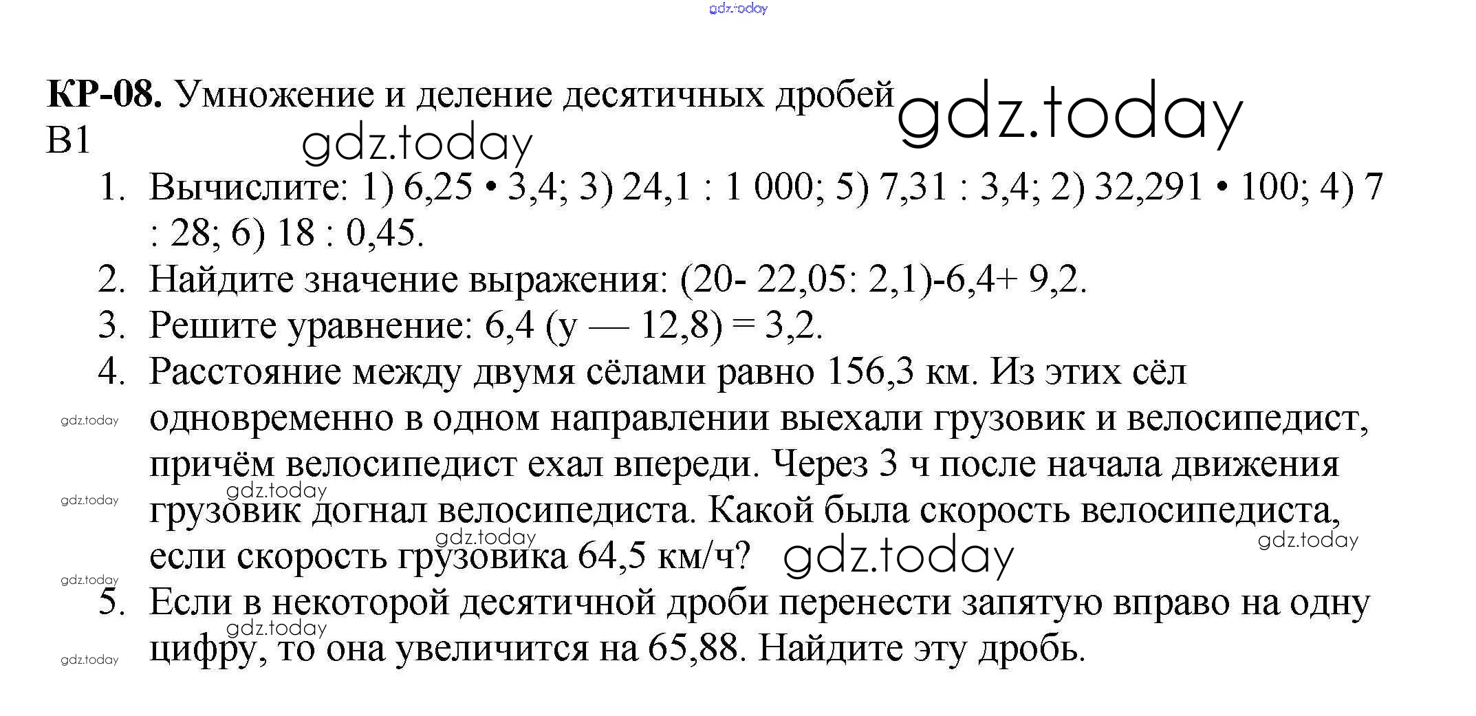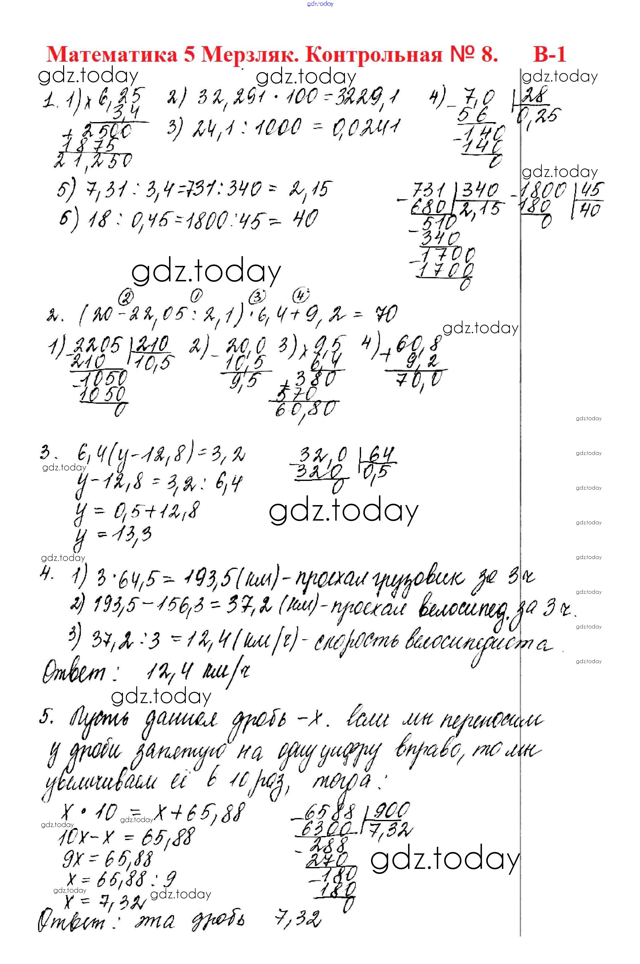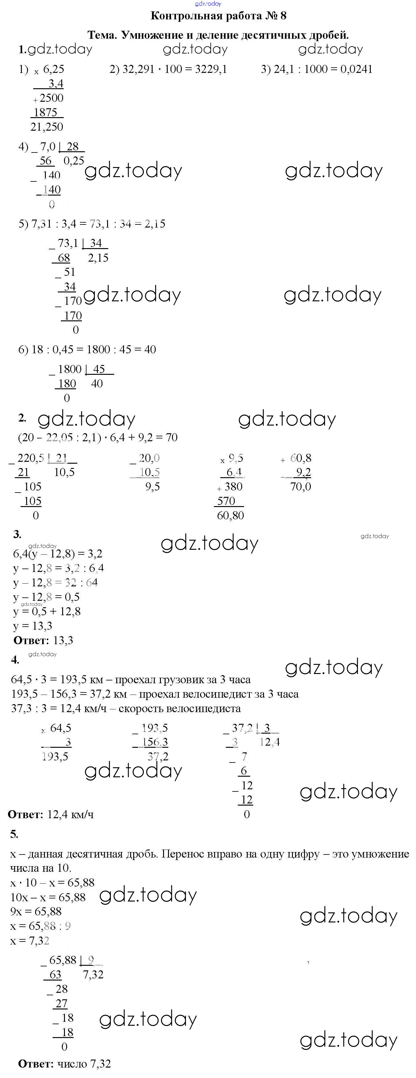 Ответы к КР №8. Умножение и деление десятичных дробей Решение к контрольные работам вариант 1 Дидактическим материалам по Математике для 5 класса Мерзляк, Полонский Вентана-граф Алгоритм успеха 2017