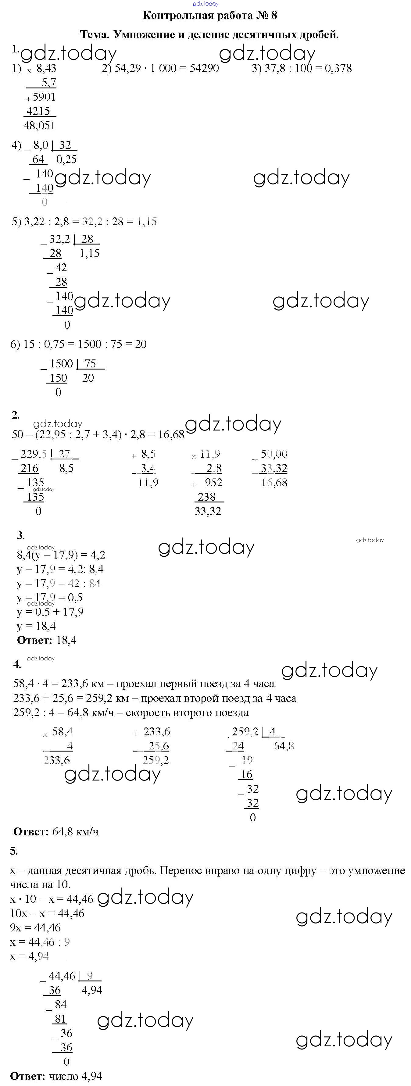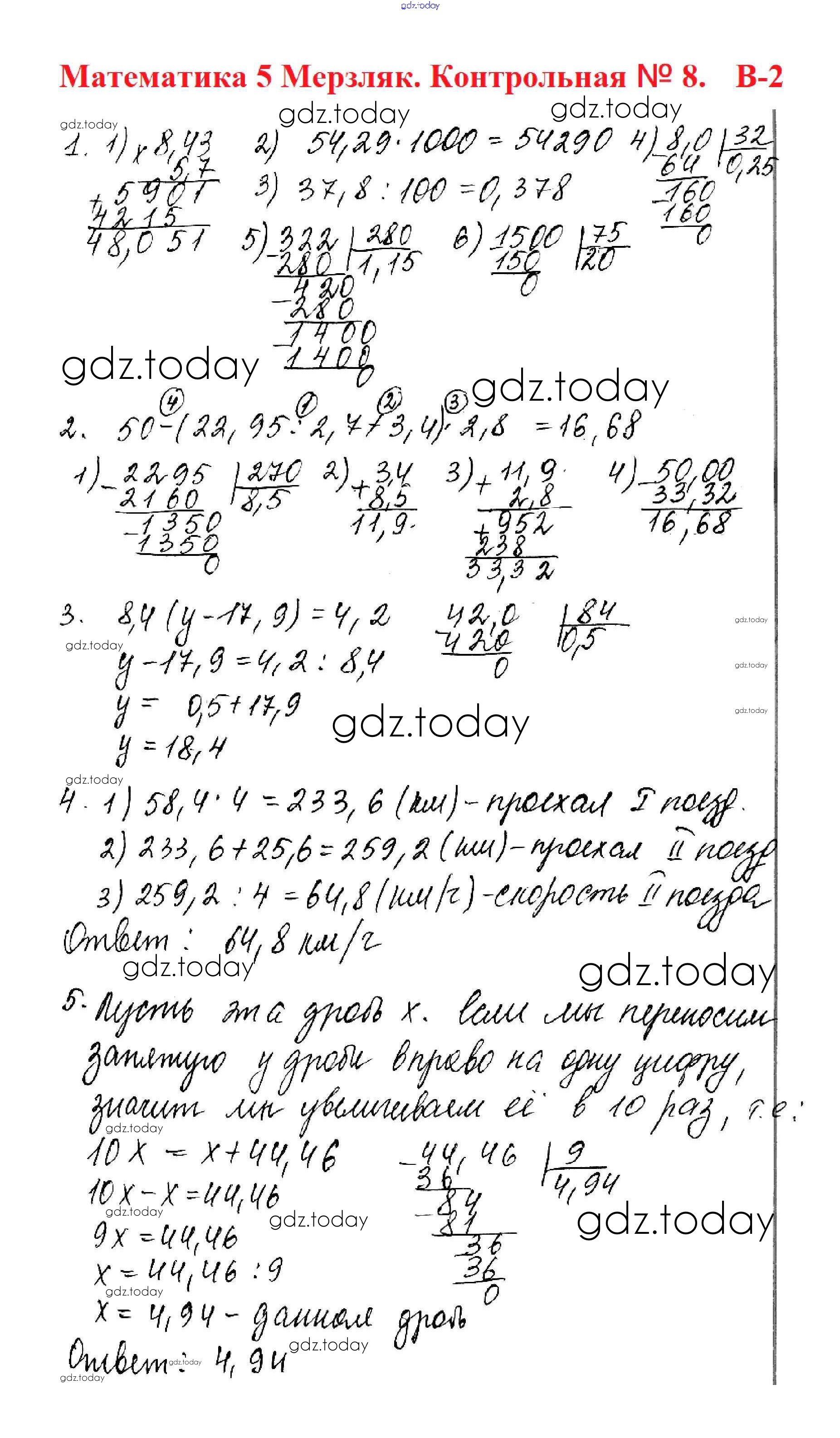Ответы к КР №8. Умножение и деление десятичных дробей Решение к контрольные работам вариант 2 Дидактическим материалам по Математике для 5 класса Мерзляк, Полонский Вентана-граф Алгоритм успеха 2017