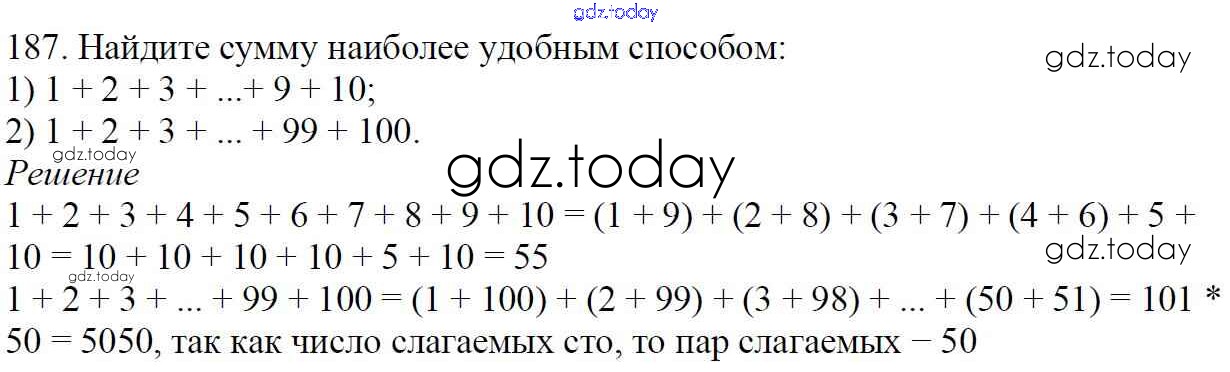 На страницах сайта gdz.today вы найдете учебный и вспомогательный материал, направленный на улучшения знаний школьной программы. ГДЗ - онлайн мир знаний § 7. Сложение натуральных чисел. Свойства сложения Решение к главе 2. Сложение и вычитание натуральных чисел 187 Учебнику по Математике для 5 класса Мерзляк, Полонский Вентана-граф Алгоритм успеха 2016