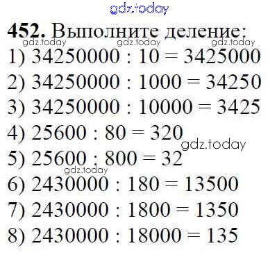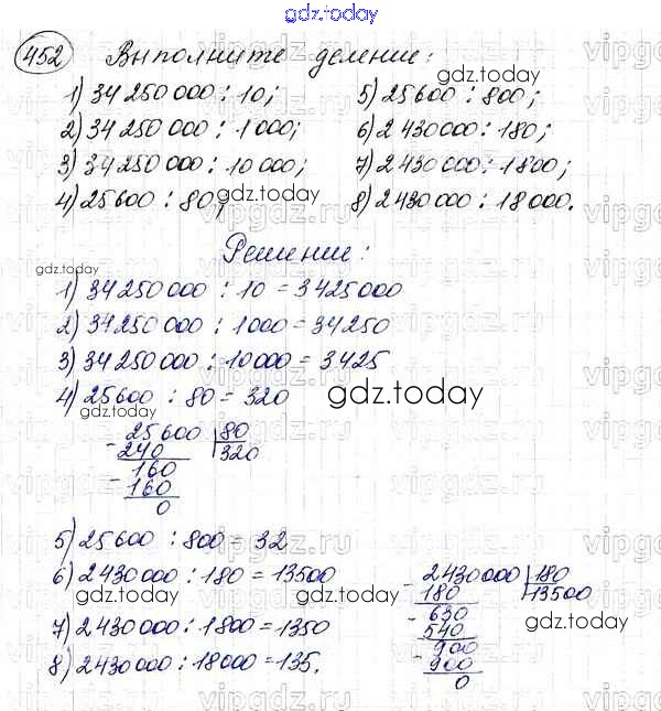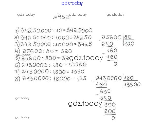 Ответы к §18. Деление Решение к главе 3. Умножение и деление натуральных чисел 452 Учебнику по Математике для 5 класса Мерзляк, Полонский Вентана-граф Алгоритм успеха 2016