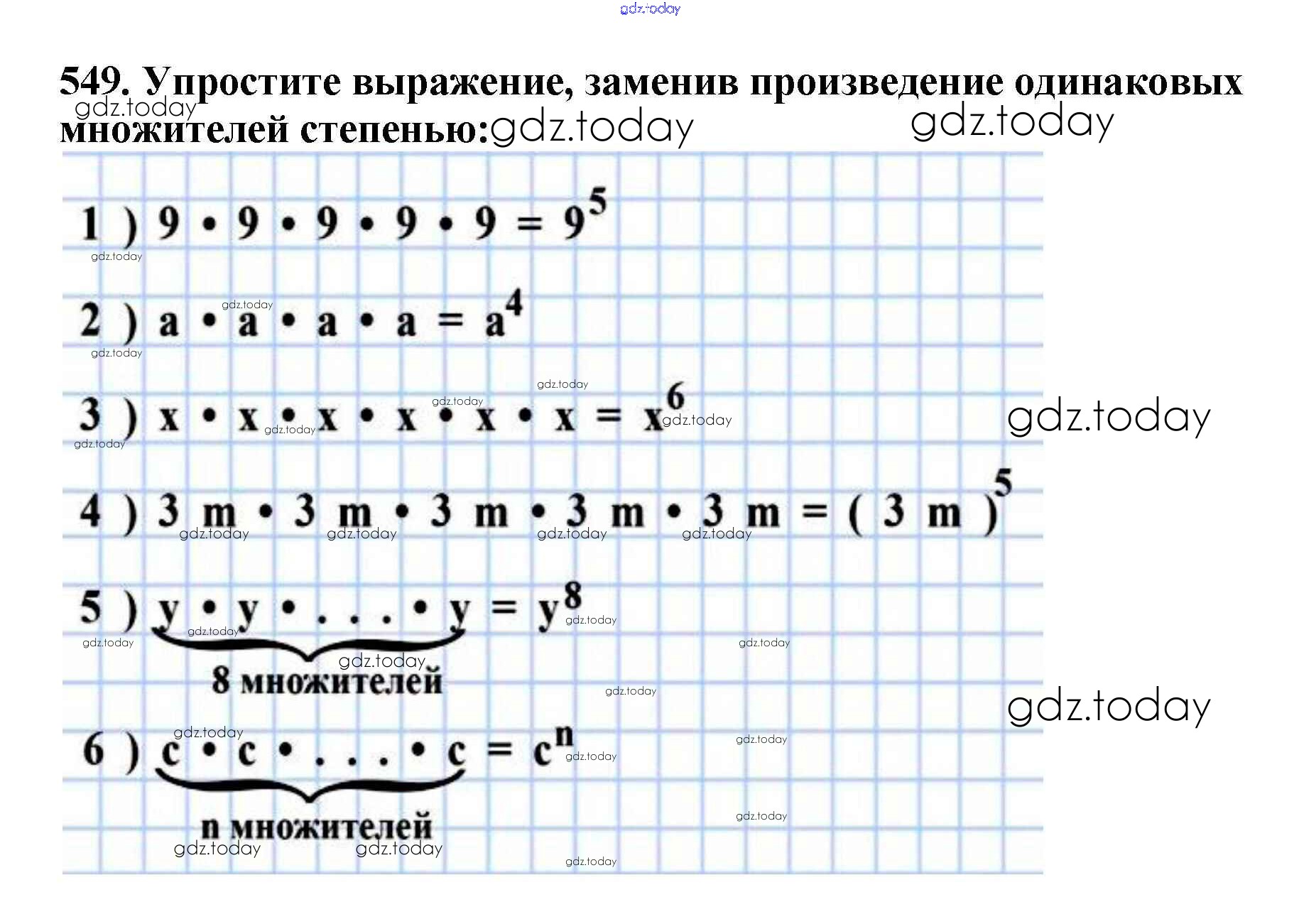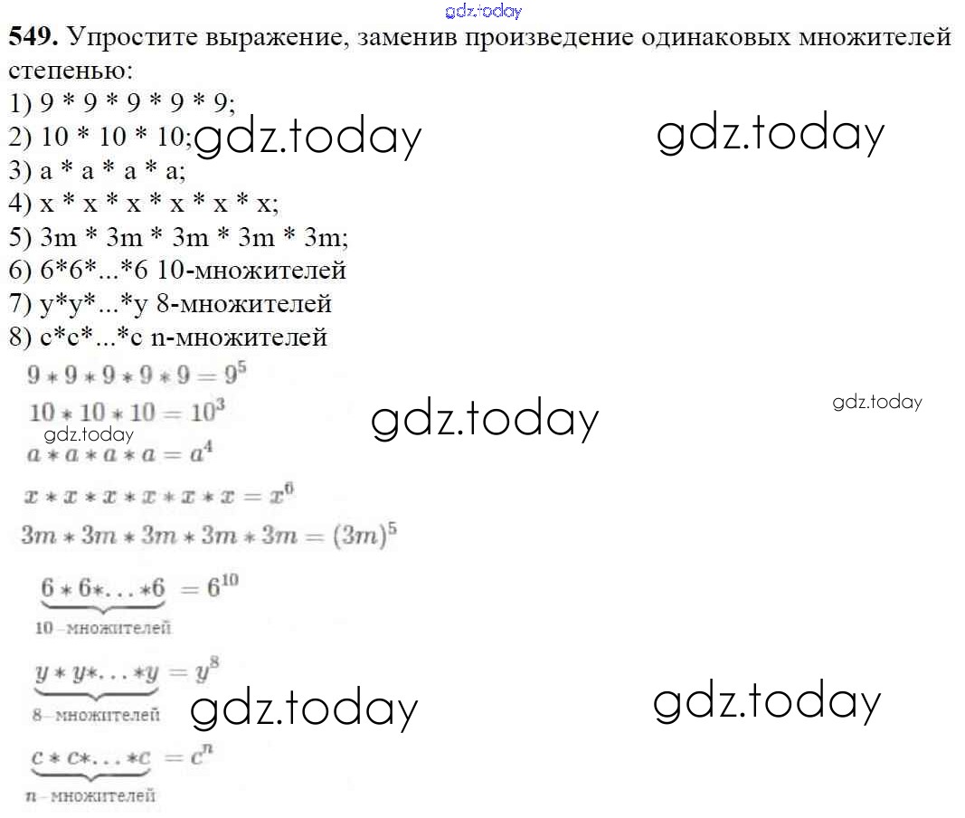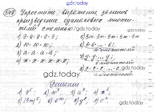 На страницах сайта gdz.today вы найдете учебный и вспомогательный материал, направленный на улучшения знаний школьной программы. ГДЗ - онлайн мир знаний §20. Степень числа Решение к главе 3. Умножение и деление натуральных чисел 549 Учебнику по Математике для 5 класса Мерзляк, Полонский Вентана-граф Алгоритм успеха 2016