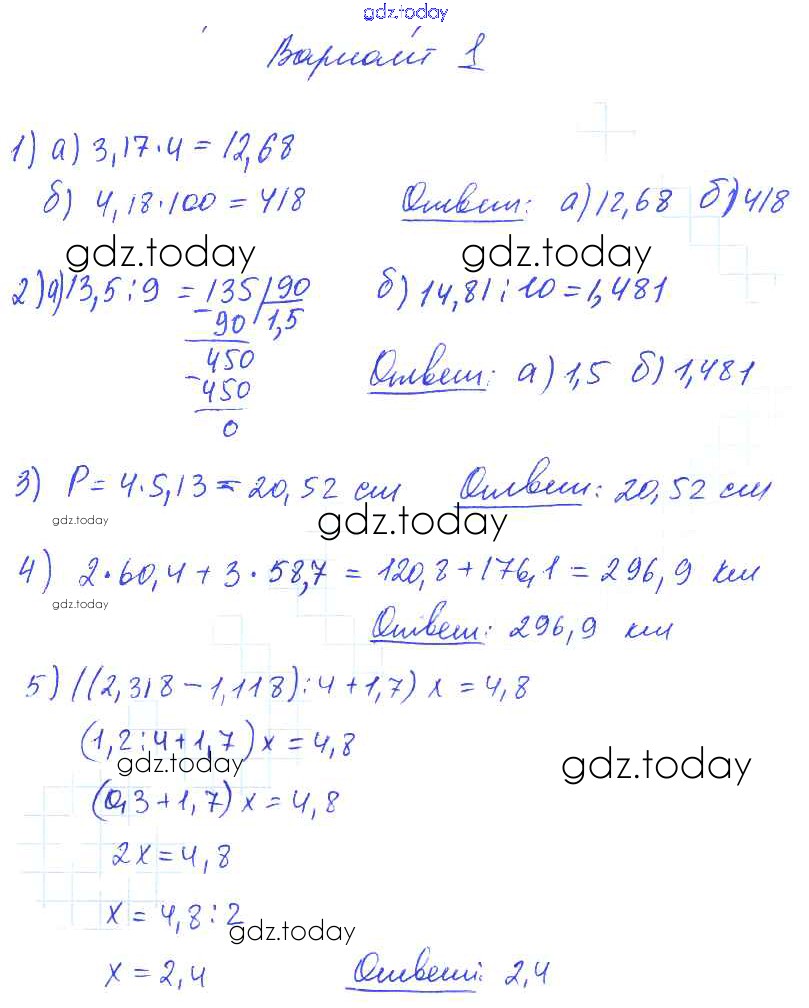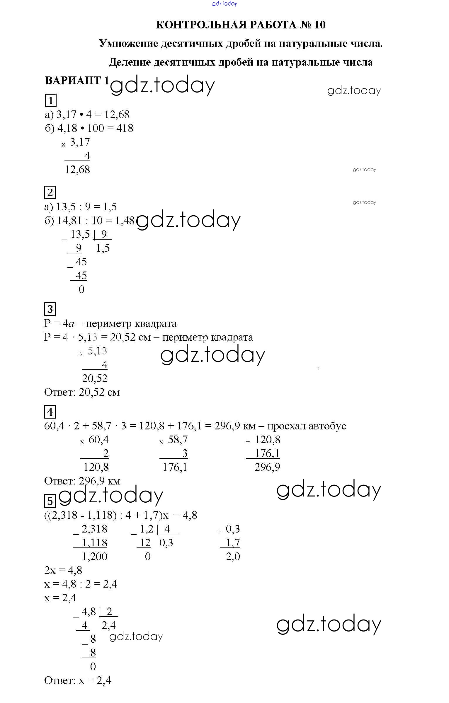 На страницах сайта gdz.today вы найдете учебный и вспомогательный материал, направленный на улучшения знаний школьной программы. ГДЗ - онлайн мир знаний КР №10. Умножение и деление десятичных дробей на натуральные числа Решение к контрольным работам вариант №1 Дидактическим материалам по Математике для 5 класса Попов Экзамен УМК 2017