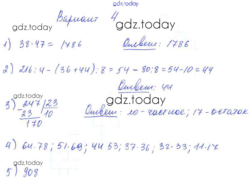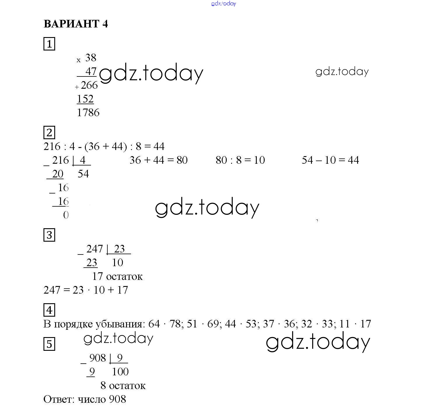 Ответы к КР №4. Умножение натуральных чисел и его свойства. Деление. Деление с остатком Решение к контрольным работам вариант №4 Дидактическим материалам по Математике для 5 класса Попов Экзамен УМК 2017