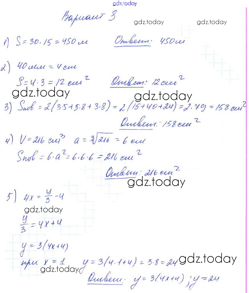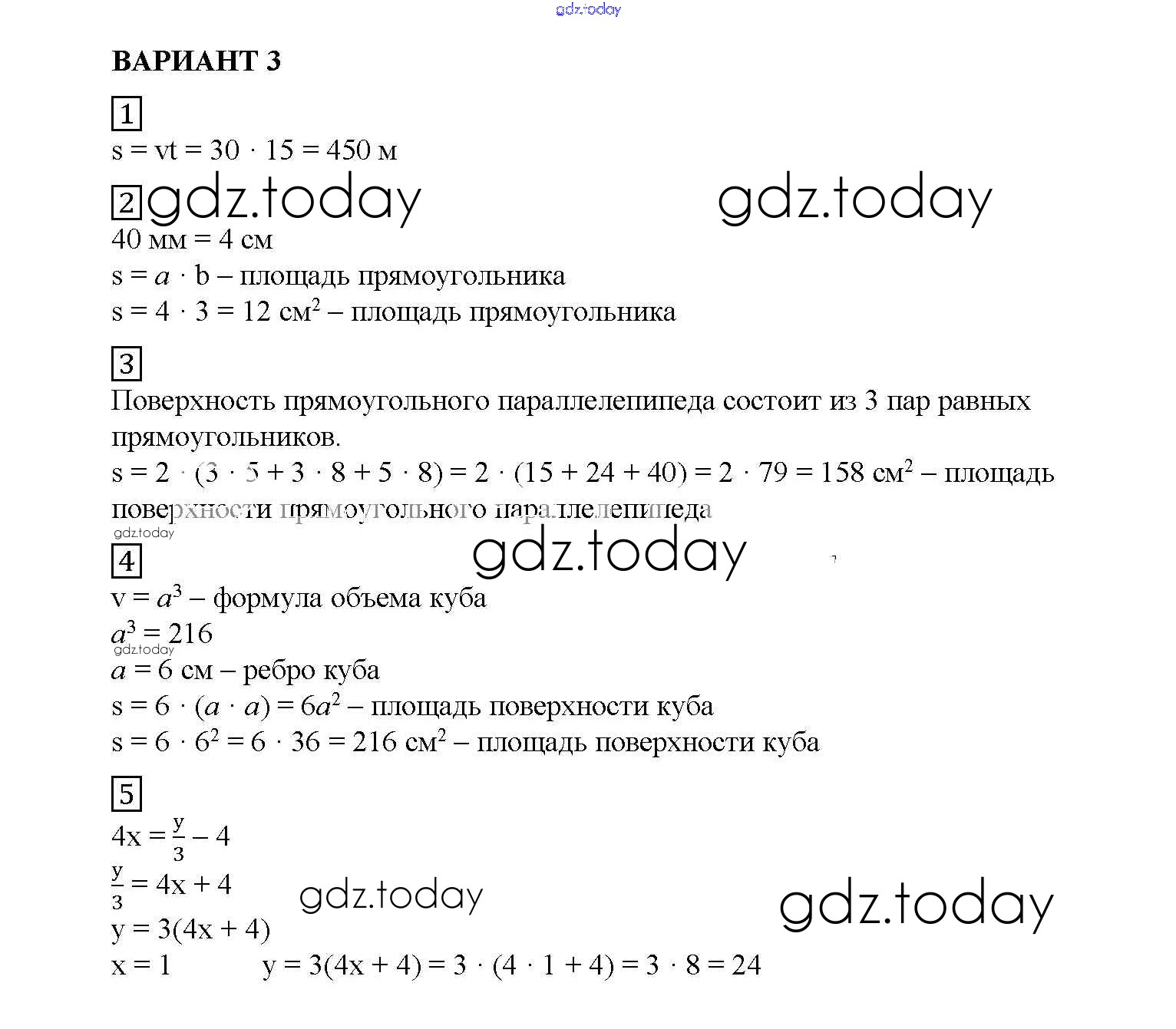 Ответы к КР №6. Формулы. Площадь. Формула площади прямоугольника Решение к контрольным работам вариант №3 Дидактическим материалам по Математике для 5 класса Попов Экзамен УМК 2017