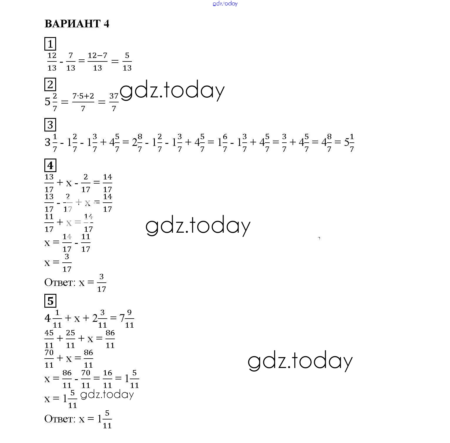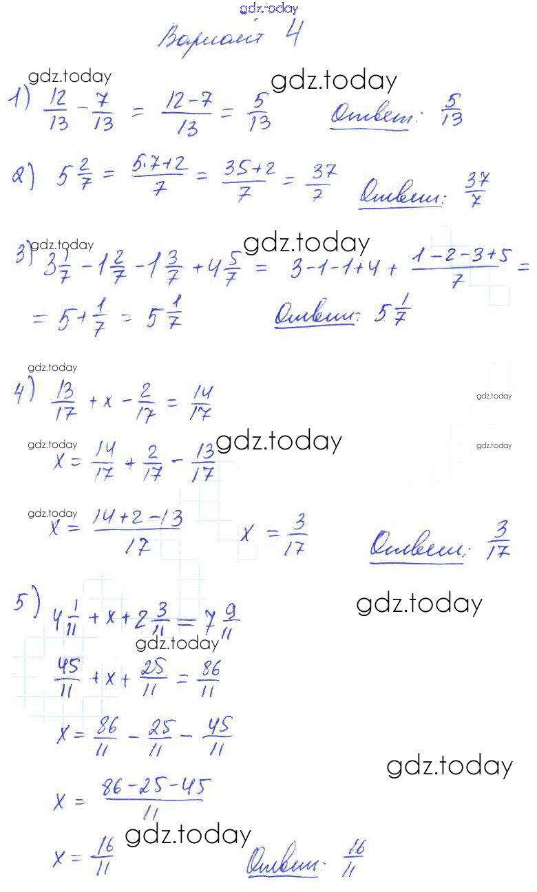 Ответы к КР №8. Сложение и вычитание дробей с одинаковыми знаменателями. Деление и дроби Решение к контрольным работам вариант №4 Дидактическим материалам по Математике для 5 класса Попов Экзамен УМК 2017