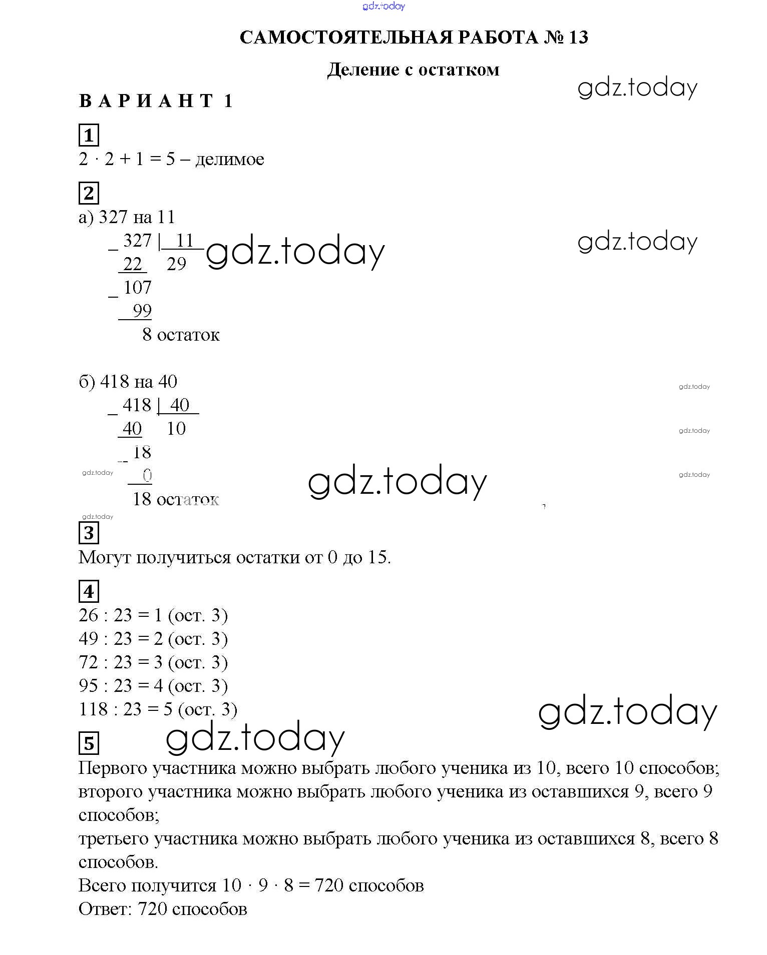 На страницах сайта gdz.today вы найдете учебный и вспомогательный материал, направленный на улучшения знаний школьной программы. ГДЗ - онлайн мир знаний СР №13. Деление с остатком Решение к самостоятельным работам вариант №1 Дидактическим материалам по Математике для 5 класса Попов Экзамен УМК 2017
