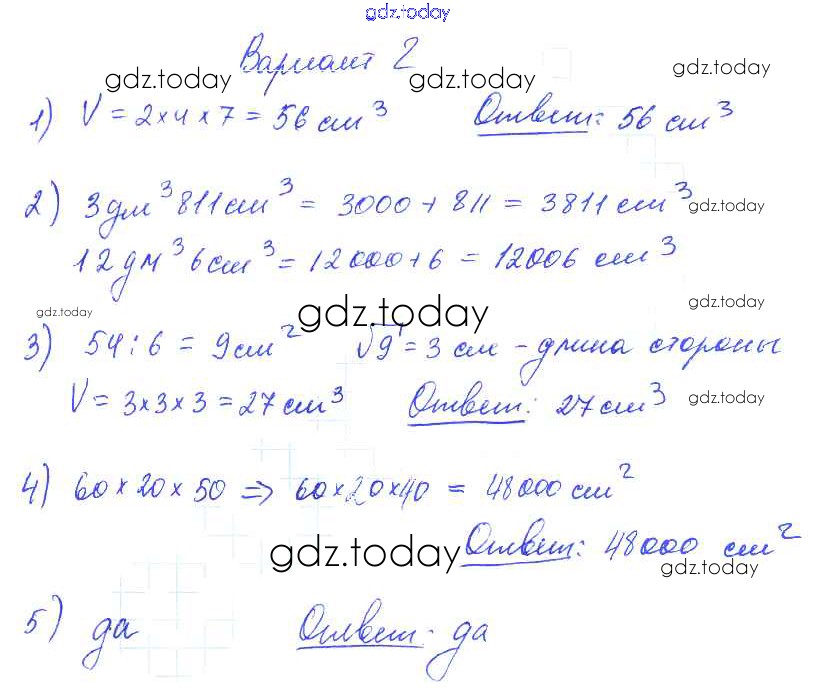 На страницах сайта gdz.today вы найдете учебный и вспомогательный материал, направленный на улучшения знаний школьной программы. ГДЗ - онлайн мир знаний СР №21. Объемы. Объем прямоугольного параллелепипеда Решение к самостоятельным работам вариант №2 Дидактическим материалам по Математике для 5 класса Попов Экзамен УМК 2017