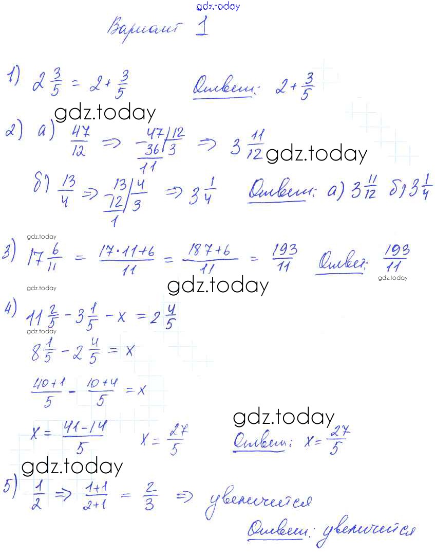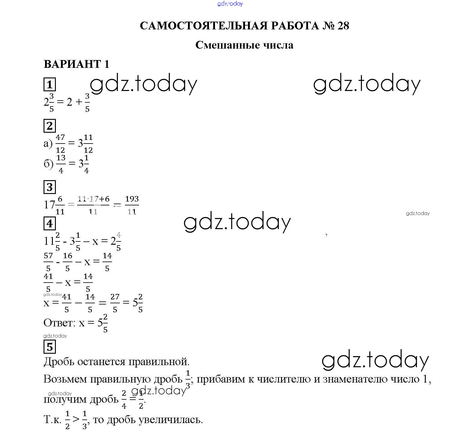 Ответы к СР №28. Смешанные числа Решение к самостоятельным работам вариант №1 Дидактическим материалам по Математике для 5 класса Попов Экзамен УМК 2017