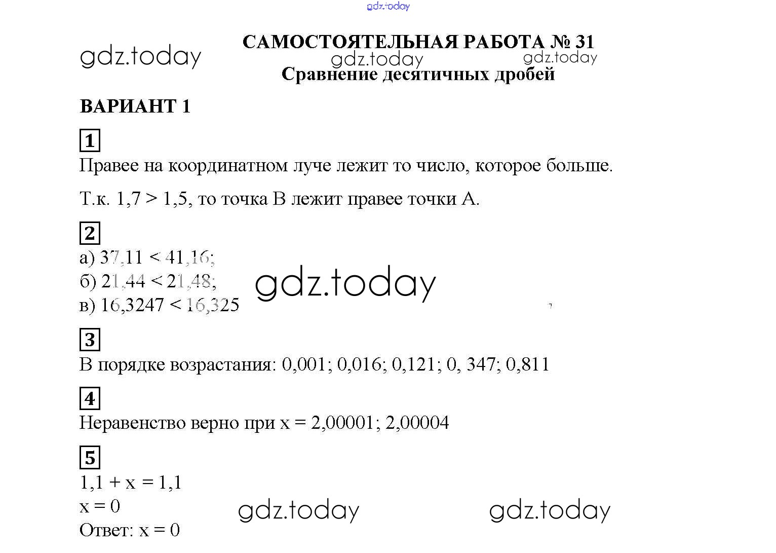 Ответы к СР №31. Сравнение десятичных дробей Решение к самостоятельным работам вариант №1 Дидактическим материалам по Математике для 5 класса Попов Экзамен УМК 2017