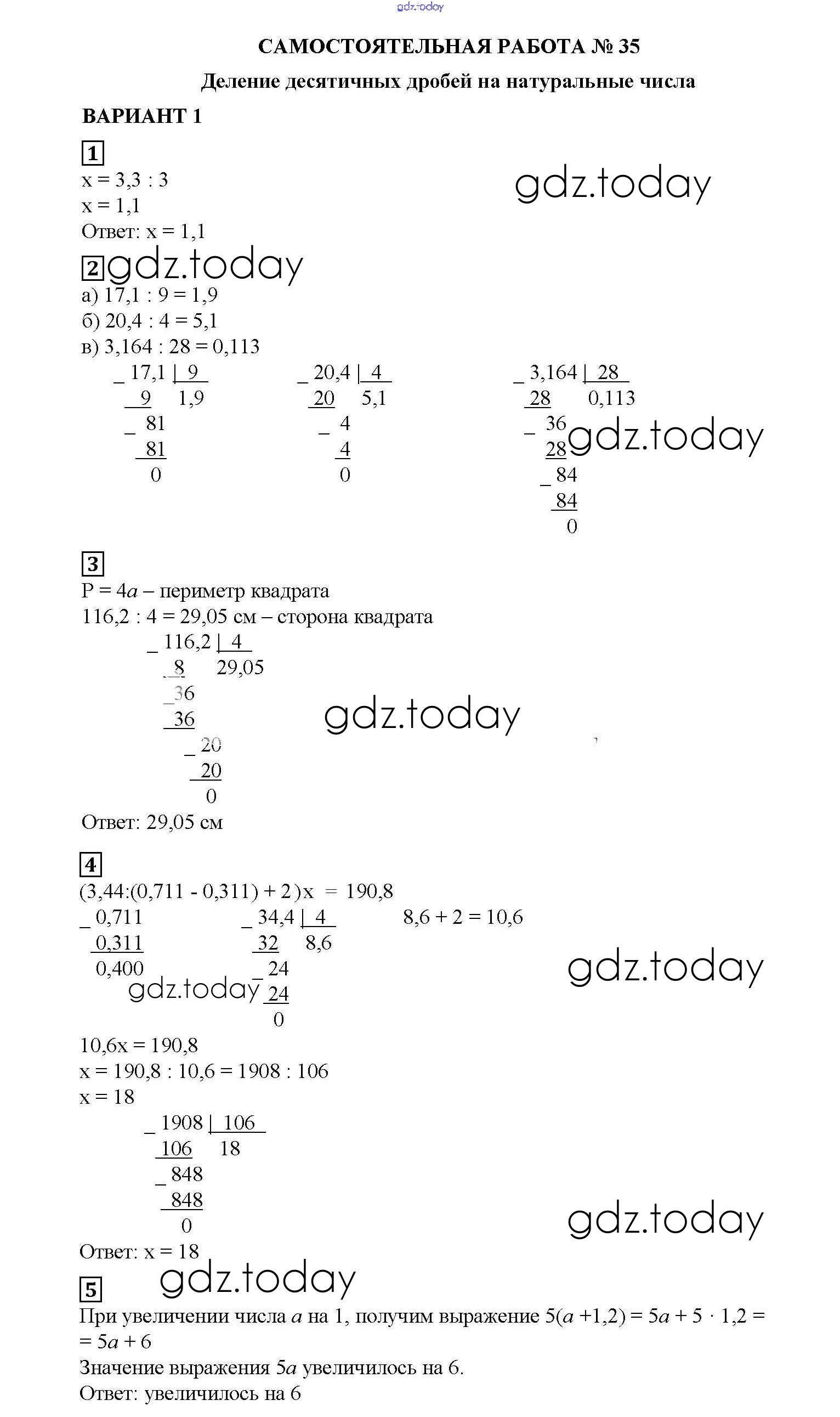 На страницах сайта gdz.today вы найдете учебный и вспомогательный материал, направленный на улучшения знаний школьной программы. ГДЗ - онлайн мир знаний СР №35. Деление десятичных дробей на натуральные числа Решение к самостоятельным работам вариант №1 Дидактическим материалам по Математике для 5 класса Попов Экзамен УМК 2017