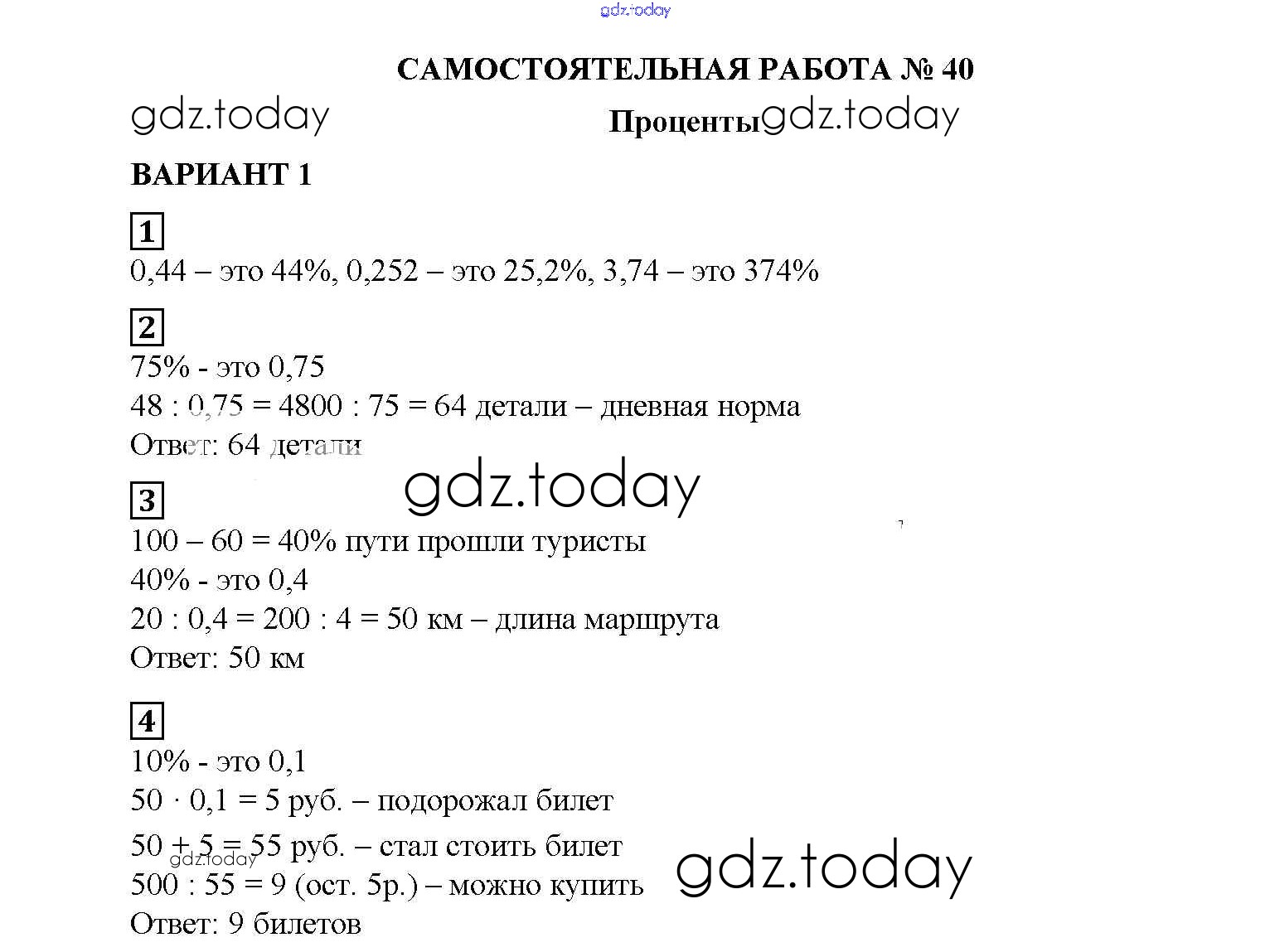 На страницах сайта gdz.today вы найдете учебный и вспомогательный материал, направленный на улучшения знаний школьной программы. ГДЗ - онлайн мир знаний СР №40. Проценты Решение к самостоятельным работам вариант №1 Дидактическим материалам по Математике для 5 класса Попов Экзамен УМК 2017