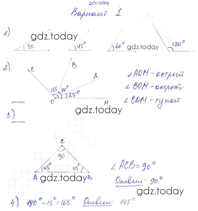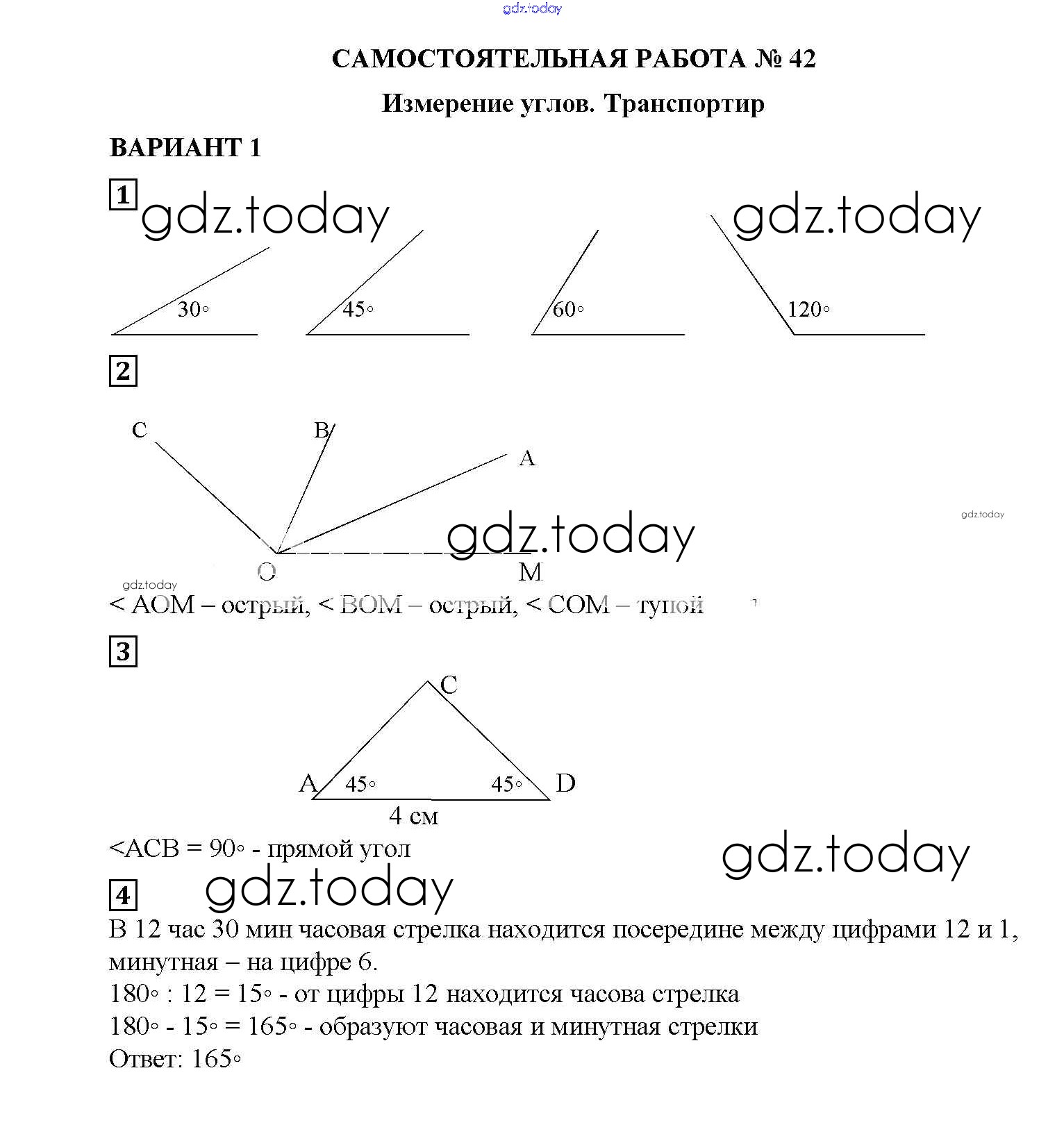 Ответы к СР №42. Измерение углов. Транспортир Решение к самостоятельным работам вариант №1 Дидактическим материалам по Математике для 5 класса Попов Экзамен УМК 2017