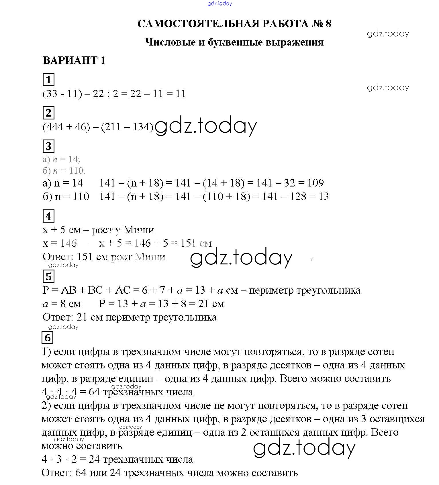 Ответы к СР №8. Числовые и буквенные выражения Решение к самостоятельным работам вариант №1 Дидактическим материалам по Математике для 5 класса Попов Экзамен УМК 2017