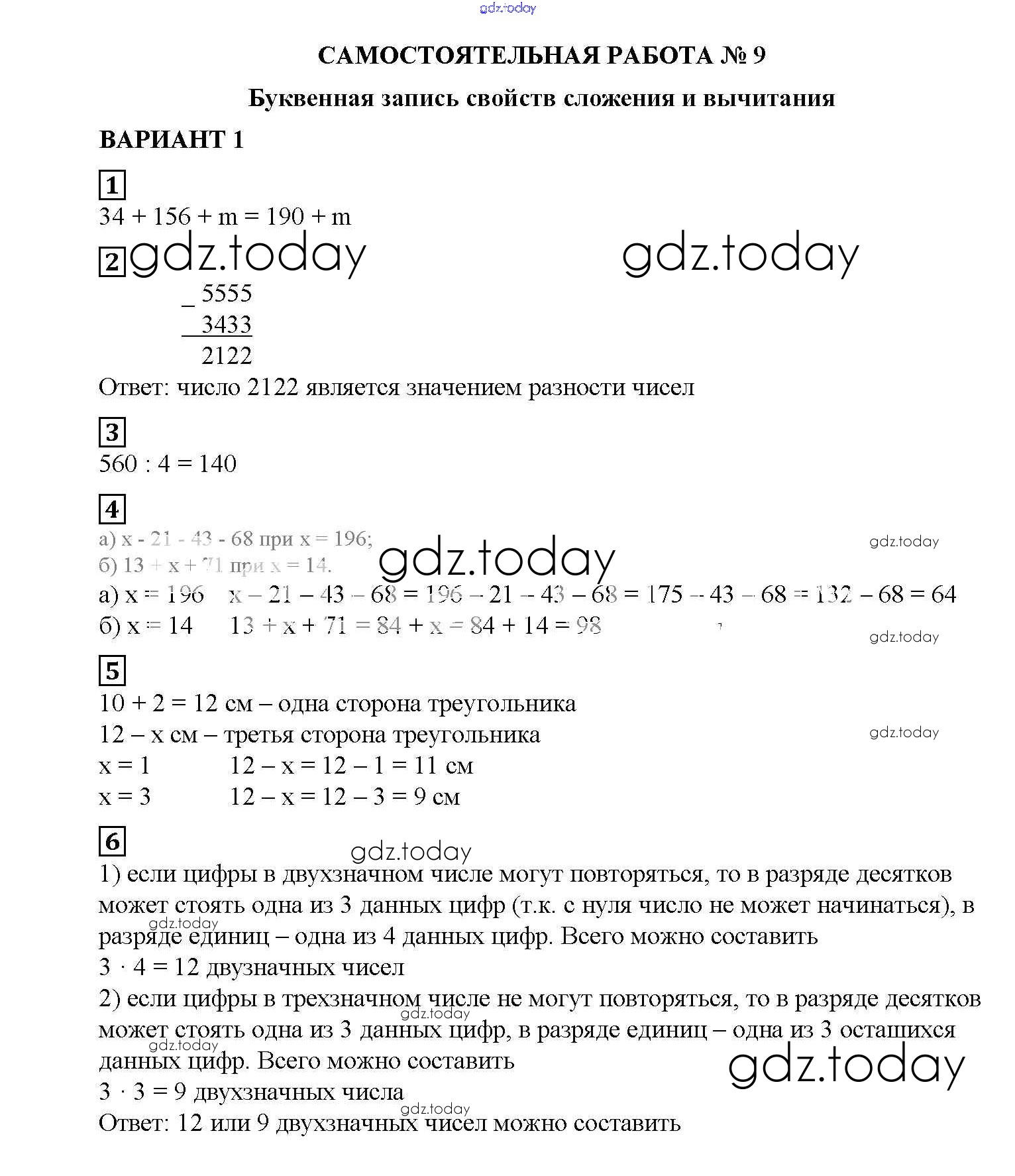 Ответы к СР №9. Буквенная запись свойств сложения и вычитания Решение к самостоятельным работам вариант №1 Дидактическим материалам по Математике для 5 класса Попов Экзамен УМК 2017