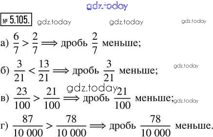 На страницах сайта gdz.today вы найдете учебный и вспомогательный материал, направленный на улучшения знаний школьной программы. ГДЗ - онлайн мир знаний Глава 5. Обыкновенные дроби Часть 2 (решение) 5.105 Учебнику по Математике для 5 класса Виленкин, Жохов Просвещение 2021