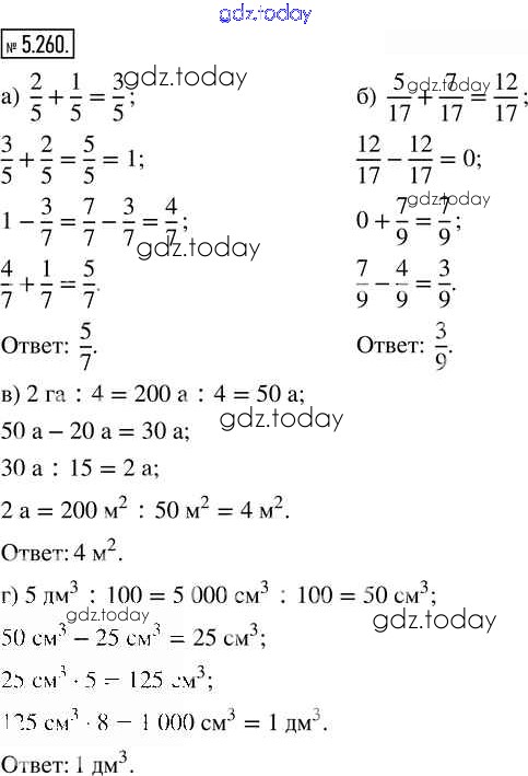 На страницах сайта gdz.today вы найдете учебный и вспомогательный материал, направленный на улучшения знаний школьной программы. ГДЗ - онлайн мир знаний Глава 5. Обыкновенные дроби Часть 2 (решение) 5.260 Учебнику по Математике для 5 класса Виленкин, Жохов Просвещение 2021