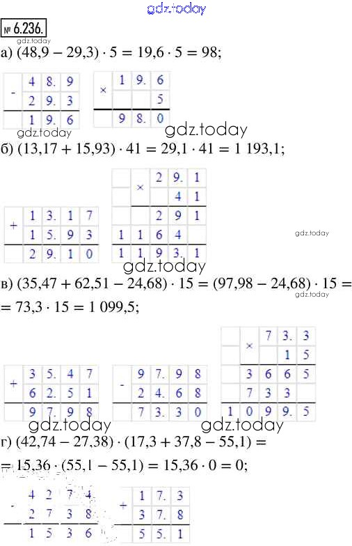 На страницах сайта gdz.today вы найдете учебный и вспомогательный материал, направленный на улучшения знаний школьной программы. ГДЗ - онлайн мир знаний Глава 6. Десятичные дроби Часть 2 (решение) 6.236 Учебнику по Математике для 5 класса Виленкин, Жохов Просвещение 2021