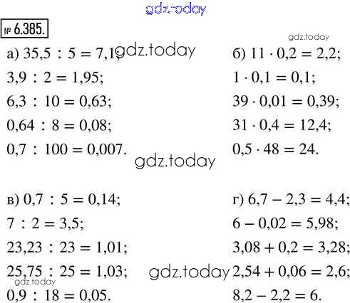 На страницах сайта gdz.today вы найдете учебный и вспомогательный материал, направленный на улучшения знаний школьной программы. ГДЗ - онлайн мир знаний Глава 6. Десятичные дроби Часть 2 (решение) 6.385 Учебнику по Математике для 5 класса Виленкин, Жохов Просвещение 2021