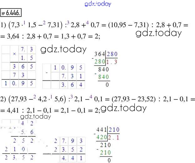 На страницах сайта gdz.today вы найдете учебный и вспомогательный материал, направленный на улучшения знаний школьной программы. ГДЗ - онлайн мир знаний Глава 6. Десятичные дроби Часть 2 (решение) 6.446 Учебнику по Математике для 5 класса Виленкин, Жохов Просвещение 2021