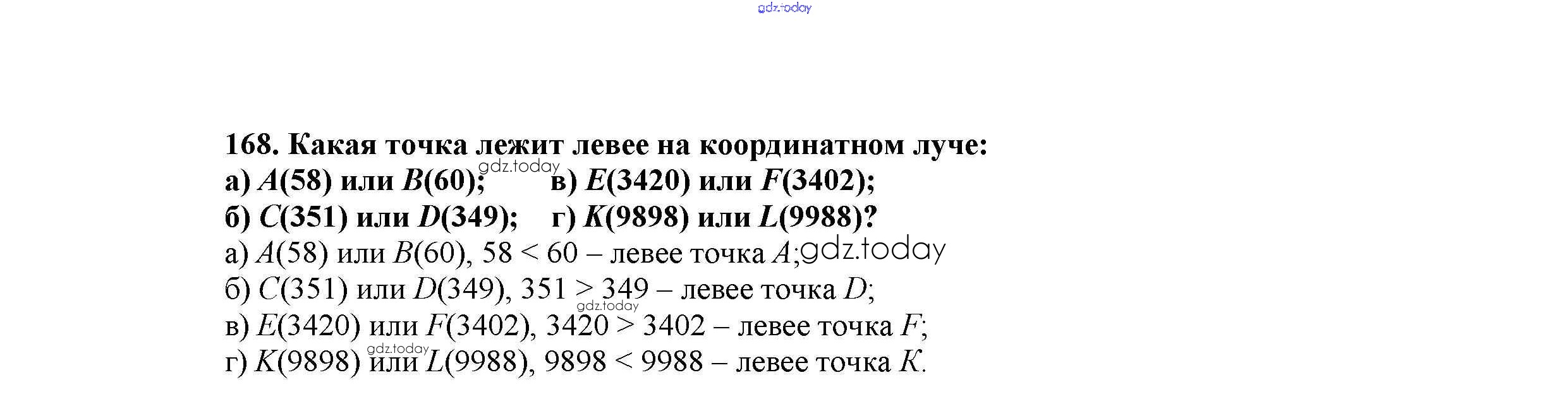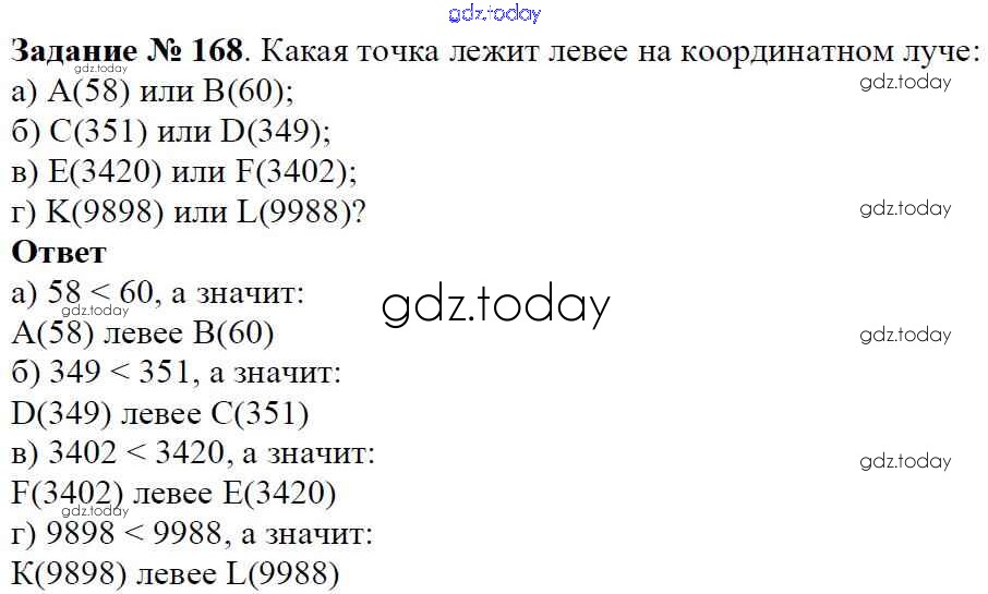 На страницах сайта gdz.today вы найдете учебный и вспомогательный материал, направленный на улучшения знаний школьной программы. ГДЗ - онлайн мир знаний Решение к главе 1. Натуральные числа (упражнения с 1 по 849) 168 Учебнику по Математике для 5 класса Виленкин, Жохов Мнемозина 2013