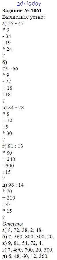 На страницах сайта gdz.today вы найдете учебный и вспомогательный материал, направленный на улучшения знаний школьной программы. ГДЗ - онлайн мир знаний Решение к главе2. Дробные числа (упражнения с 850 по 1849) 1061 Учебнику по Математике для 5 класса Виленкин, Жохов Мнемозина 2013