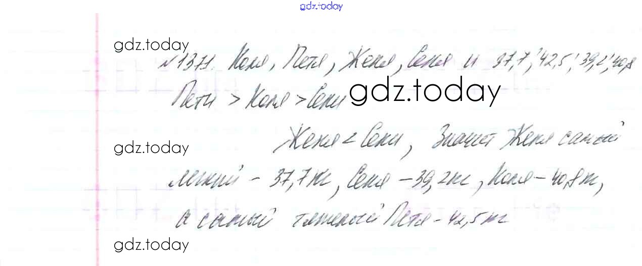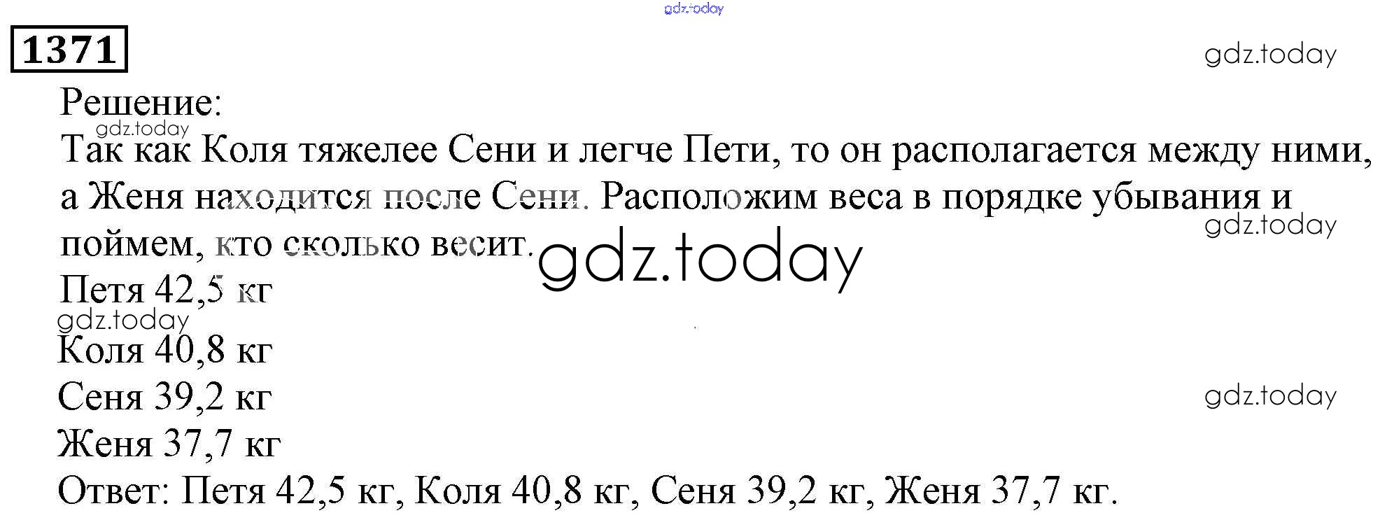 На страницах сайта gdz.today вы найдете учебный и вспомогательный материал, направленный на улучшения знаний школьной программы. ГДЗ - онлайн мир знаний Решение к главе2. Дробные числа (упражнения с 850 по 1849) 1371 Учебнику по Математике для 5 класса Виленкин, Жохов Мнемозина 2013