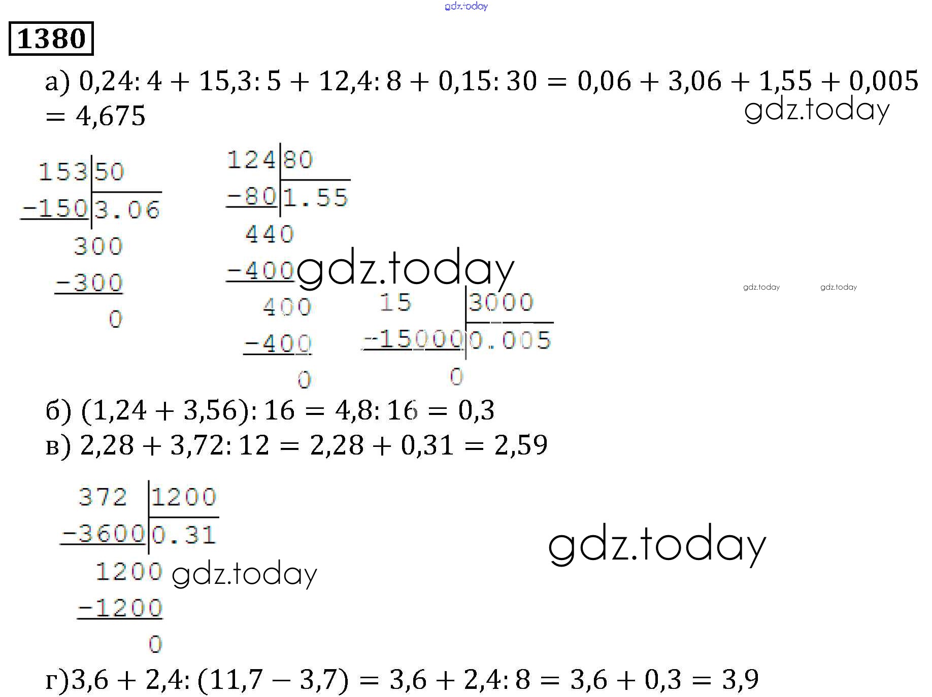 На страницах сайта gdz.today вы найдете учебный и вспомогательный материал, направленный на улучшения знаний школьной программы. ГДЗ - онлайн мир знаний Решение к главе2. Дробные числа (упражнения с 850 по 1849) 1380 Учебнику по Математике для 5 класса Виленкин, Жохов Мнемозина 2013