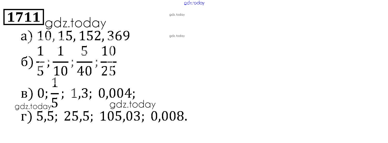 На страницах сайта gdz.today вы найдете учебный и вспомогательный материал, направленный на улучшения знаний школьной программы. ГДЗ - онлайн мир знаний Решение к главе2. Дробные числа (упражнения с 850 по 1849) 1711 Учебнику по Математике для 5 класса Виленкин, Жохов Мнемозина 2013