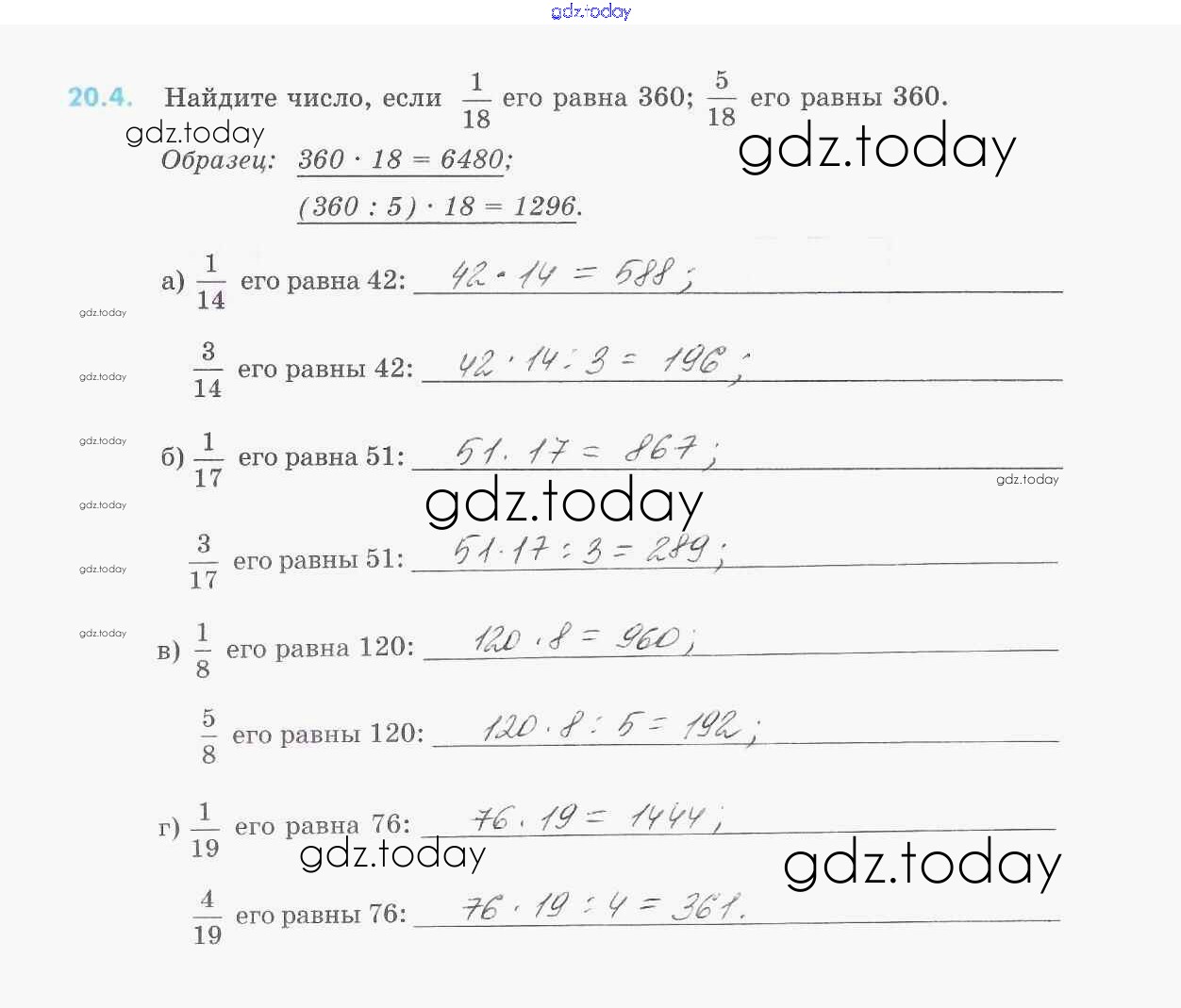 Ответы к Решение к §20. Отыскание части от целого и целого по его части 4 Рабочей тетради по Математике для 5 класса Зубарева Мнемозина УМК 2014