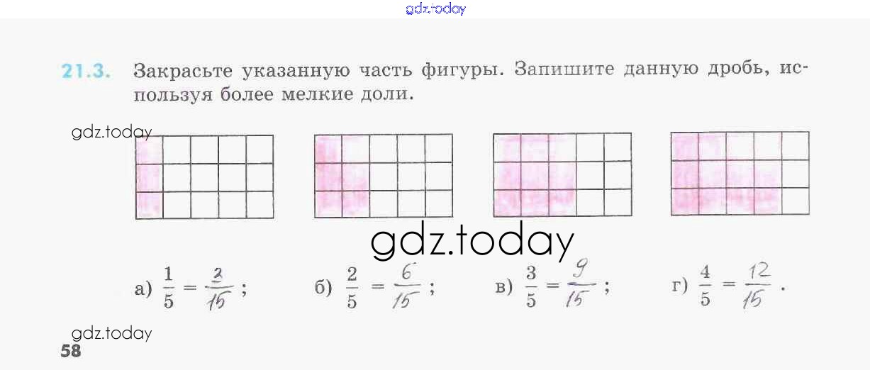 На страницах сайта gdz.today вы найдете учебный и вспомогательный материал, направленный на улучшения знаний школьной программы. ГДЗ - онлайн мир знаний Решение к §21. Основное свойство дроби 3 Рабочей тетради по Математике для 5 класса Зубарева Мнемозина УМК 2014