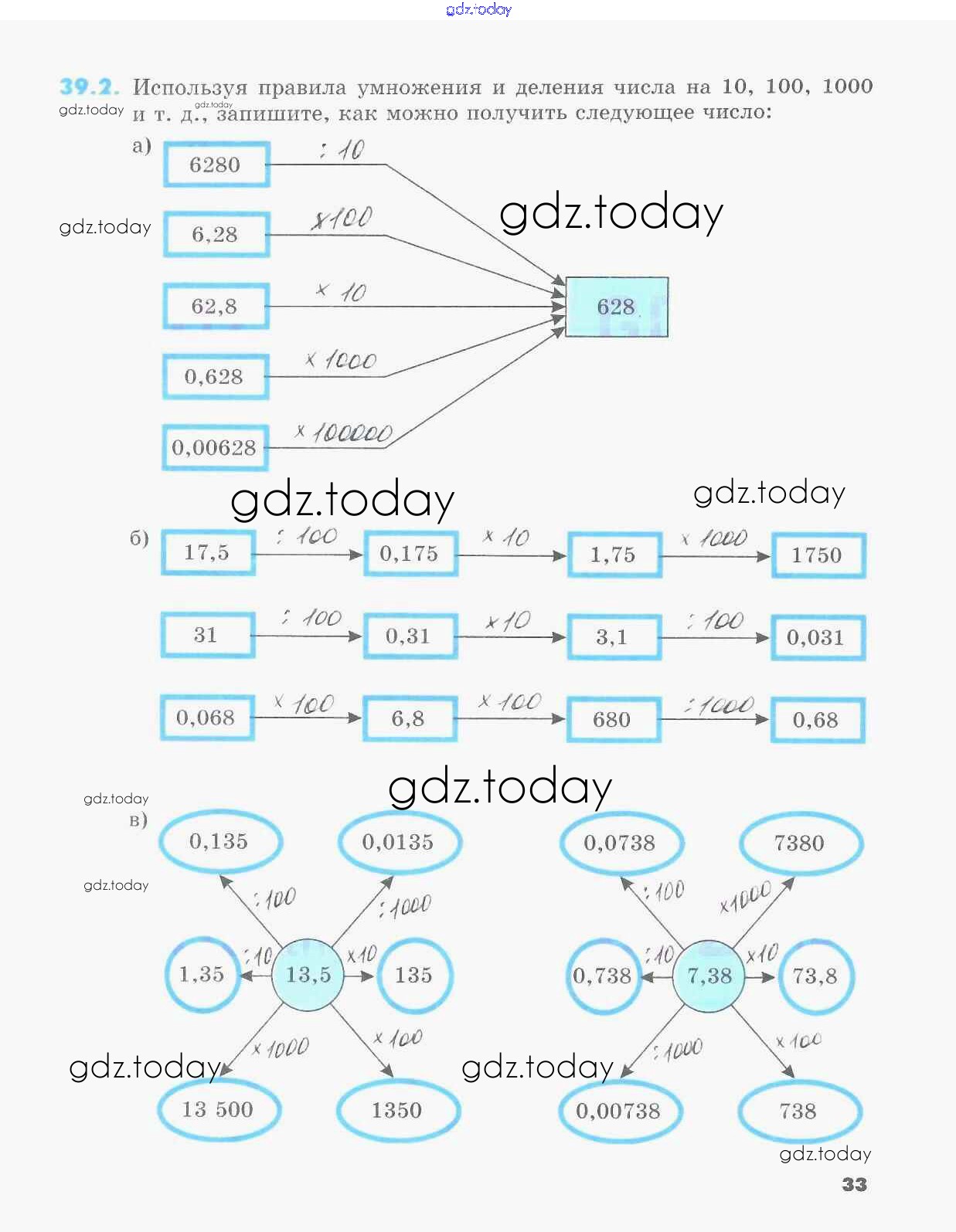 Решение к §39. Умножение и деление десятичной дроби на 10, 100, 1000 и т. д..