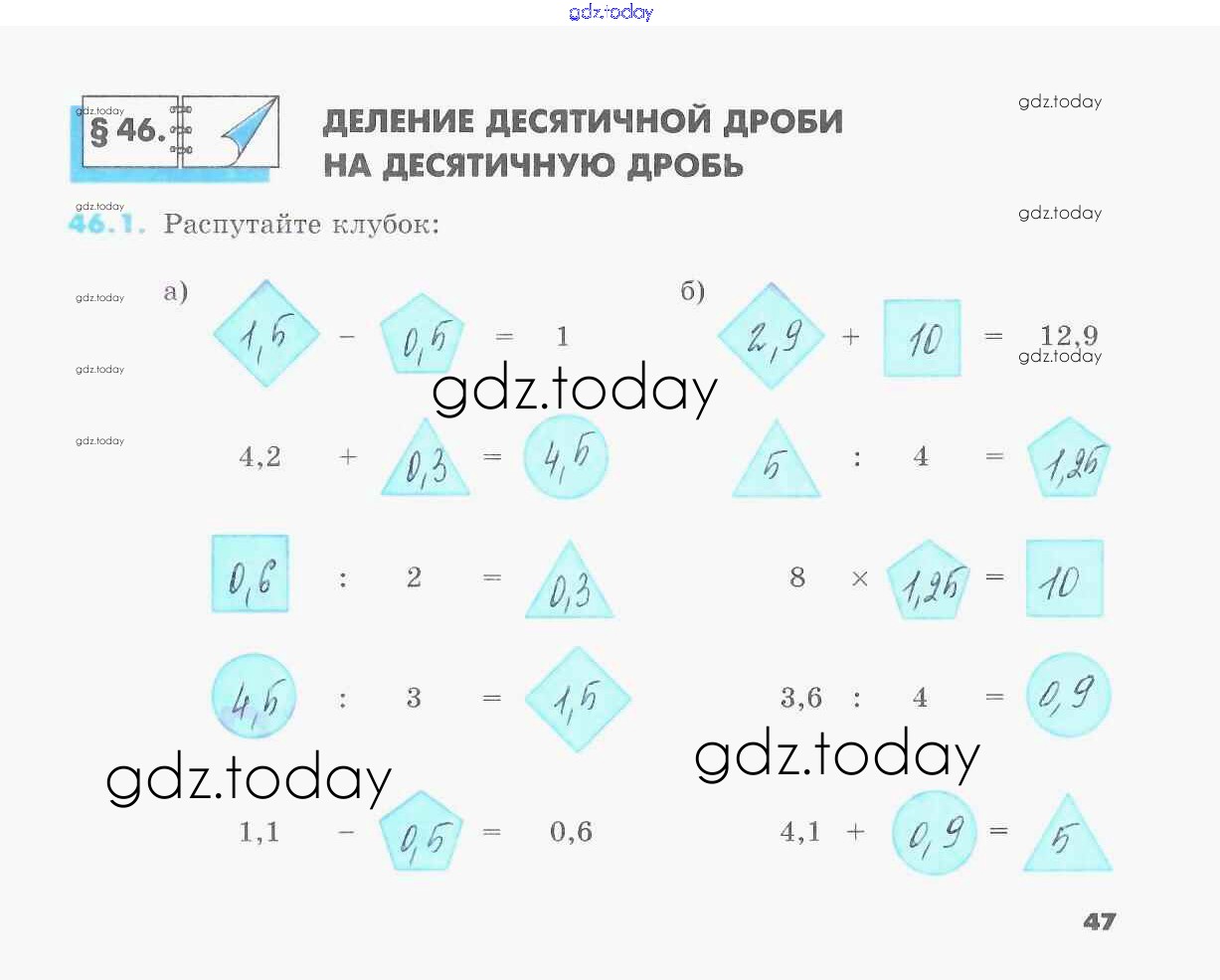 На страницах сайта gdz.today вы найдете учебный и вспомогательный материал, направленный на улучшения знаний школьной программы. ГДЗ - онлайн мир знаний Решение к §46. Деление десятичной дроби на десятичную дробь 1 Рабочей тетради по Математике для 5 класса Зубарева Мнемозина УМК 2014
