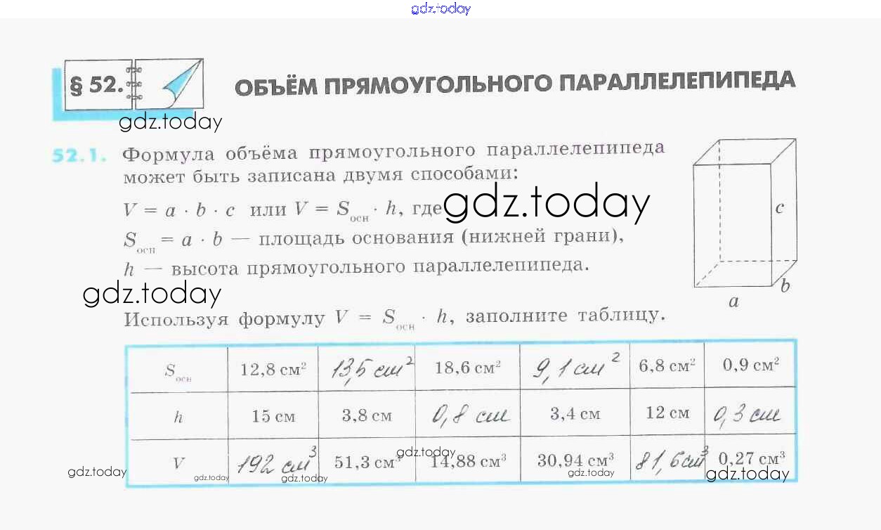 На страницах сайта gdz.today вы найдете учебный и вспомогательный материал, направленный на улучшения знаний школьной программы. ГДЗ - онлайн мир знаний Решение к §52. Объём прямоугольного параллелепипеда 1 Рабочей тетради по Математике для 5 класса Зубарева Мнемозина УМК 2014