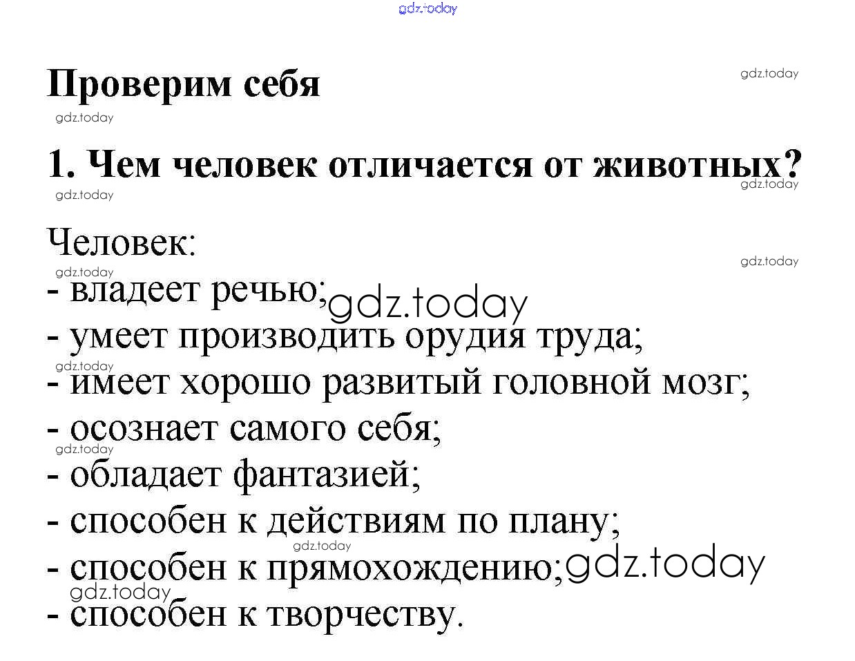 На страницах сайта gdz.today вы найдете учебный и вспомогательный материал, направленный на улучшения знаний школьной программы. ГДЗ - онлайн мир знаний Проверим себя Решение к §1 1 Учебнику по Обществознанию для 5 класса Боголюбов, Виноградова Просвещение 2013