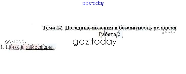 На страницах сайта gdz.today вы найдете учебный и вспомогательный материал, направленный на улучшения знаний школьной программы. ГДЗ - онлайн мир знаний Работа 2 Решение к теме 12. Погодные явления и безопасность человека 1 Рабочей тетради по ОБЖ для 5 класса Демидов Лицей 2016