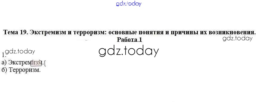 На страницах сайта gdz.today вы найдете учебный и вспомогательный материал, направленный на улучшения знаний школьной программы. ГДЗ - онлайн мир знаний Работа 1 Решение к теме 19. Экстремизм и терроризм - основные понятия и причины их возникновения 1 Рабочей тетради по ОБЖ для 5 класса Демидов Лицей 2016