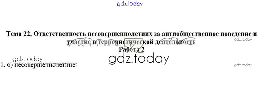 На страницах сайта gdz.today вы найдете учебный и вспомогательный материал, направленный на улучшения знаний школьной программы. ГДЗ - онлайн мир знаний Работа 2 Решение к теме 22. Ответственность несовершеннолетних за антиобщественное поведение 1 Рабочей тетради по ОБЖ для 5 класса Демидов Лицей 2016