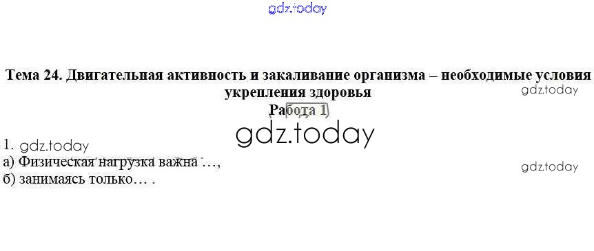 На страницах сайта gdz.today вы найдете учебный и вспомогательный материал, направленный на улучшения знаний школьной программы. ГДЗ - онлайн мир знаний Работа 1 Решение к теме 24. Двигательная активность и закаливание организма – необходимые условия укрепления здоровья 1 Рабочей тетради по ОБЖ для 5 класса Демидов Лицей 2016