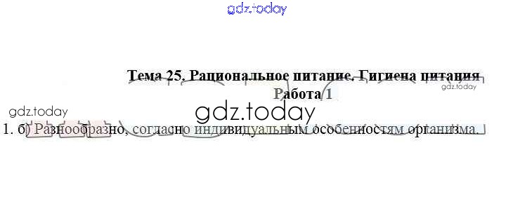 На страницах сайта gdz.today вы найдете учебный и вспомогательный материал, направленный на улучшения знаний школьной программы. ГДЗ - онлайн мир знаний Работа 1 Решение к теме 25. Рациональное питание. Гигиена питания 1 Рабочей тетради по ОБЖ для 5 класса Демидов Лицей 2016