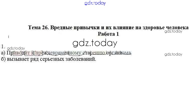 На страницах сайта gdz.today вы найдете учебный и вспомогательный материал, направленный на улучшения знаний школьной программы. ГДЗ - онлайн мир знаний Работа 1 Решение к теме 26. Вредные привычки и их влияние на здоровье человека 1 Рабочей тетради по ОБЖ для 5 класса Демидов Лицей 2016