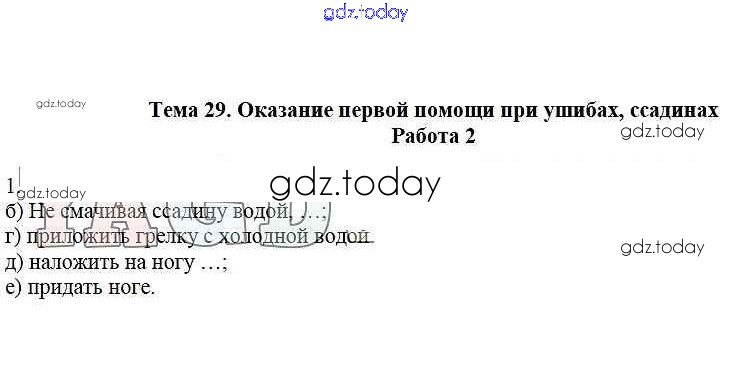 На страницах сайта gdz.today вы найдете учебный и вспомогательный материал, направленный на улучшения знаний школьной программы. ГДЗ - онлайн мир знаний Работа 2 Решение к теме 29. Оказание первой помощи при ушибах, ссадинах 1 Рабочей тетради по ОБЖ для 5 класса Демидов Лицей 2016