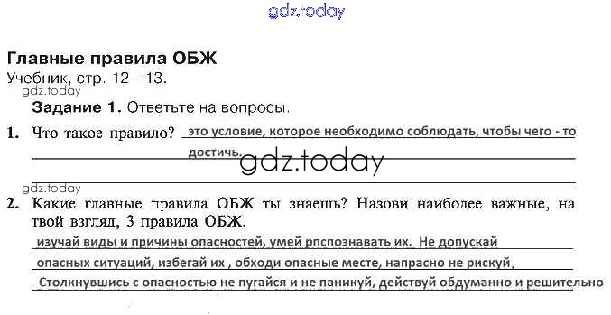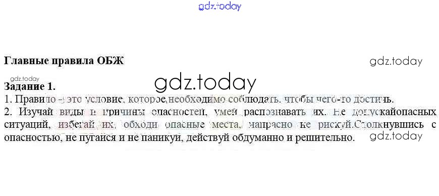 На страницах сайта gdz.today вы найдете учебный и вспомогательный материал, направленный на улучшения знаний школьной программы. ГДЗ - онлайн мир знаний Решение к §2. Главные правила ОБЖ 1 Рабочей тетради по ОБЖ для 5 класса Драновская Аст/Астрель 2014