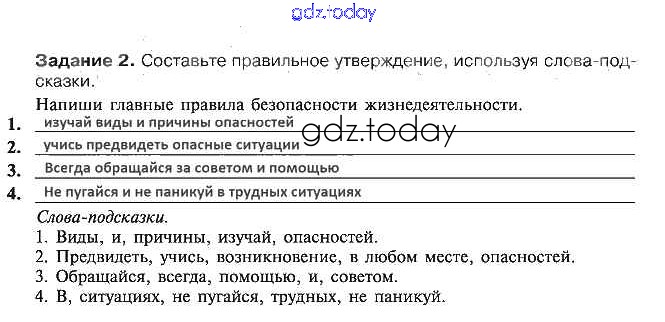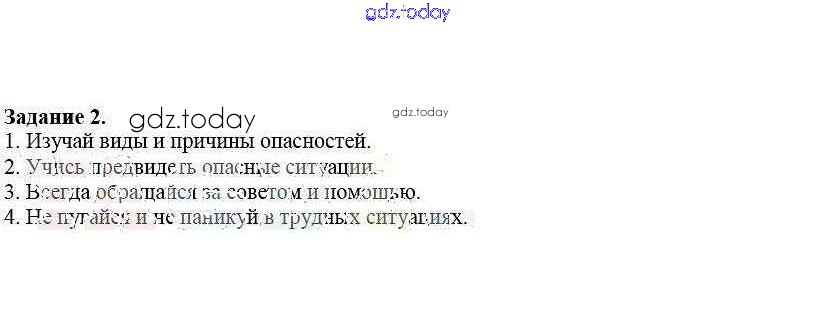 На страницах сайта gdz.today вы найдете учебный и вспомогательный материал, направленный на улучшения знаний школьной программы. ГДЗ - онлайн мир знаний Решение к §2. Главные правила ОБЖ 2 Рабочей тетради по ОБЖ для 5 класса Драновская Аст/Астрель 2014