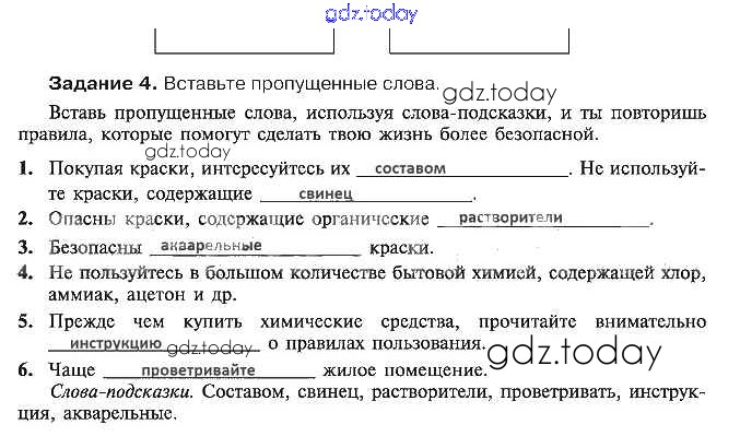 На страницах сайта gdz.today вы найдете учебный и вспомогательный материал, направленный на улучшения знаний школьной программы. ГДЗ - онлайн мир знаний Решение к §12. Как защитить себя от опасных веществ в быту 4 Рабочей тетради по ОБЖ для 5 класса Драновская Аст/Астрель 2014