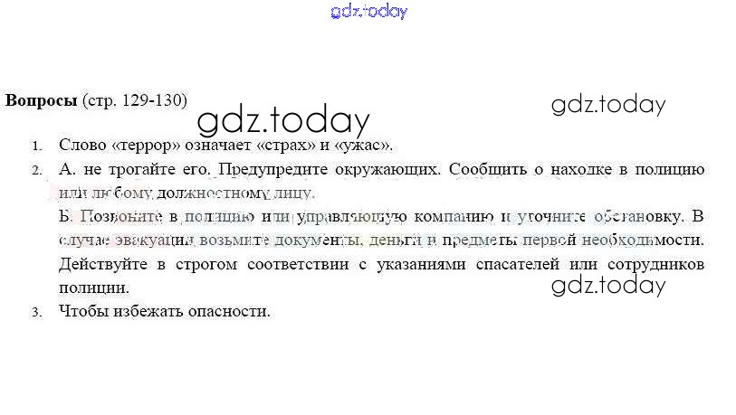 На страницах сайта gdz.today вы найдете учебный и вспомогательный материал, направленный на улучшения знаний школьной программы. ГДЗ - онлайн мир знаний Страницы (решение) 129-130 Учебнику по ОБЖ для 5 класса Фролов, Шолох Аст/Астрель 2015