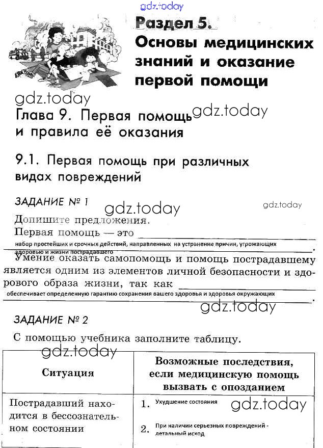 На страницах сайта gdz.today вы найдете учебный и вспомогательный материал, направленный на улучшения знаний школьной программы. ГДЗ - онлайн мир знаний Решение к главе 9 §1 Рабочей тетради по ОБЖ для 5 класса Смирнов, Хренников Просвещение 2019