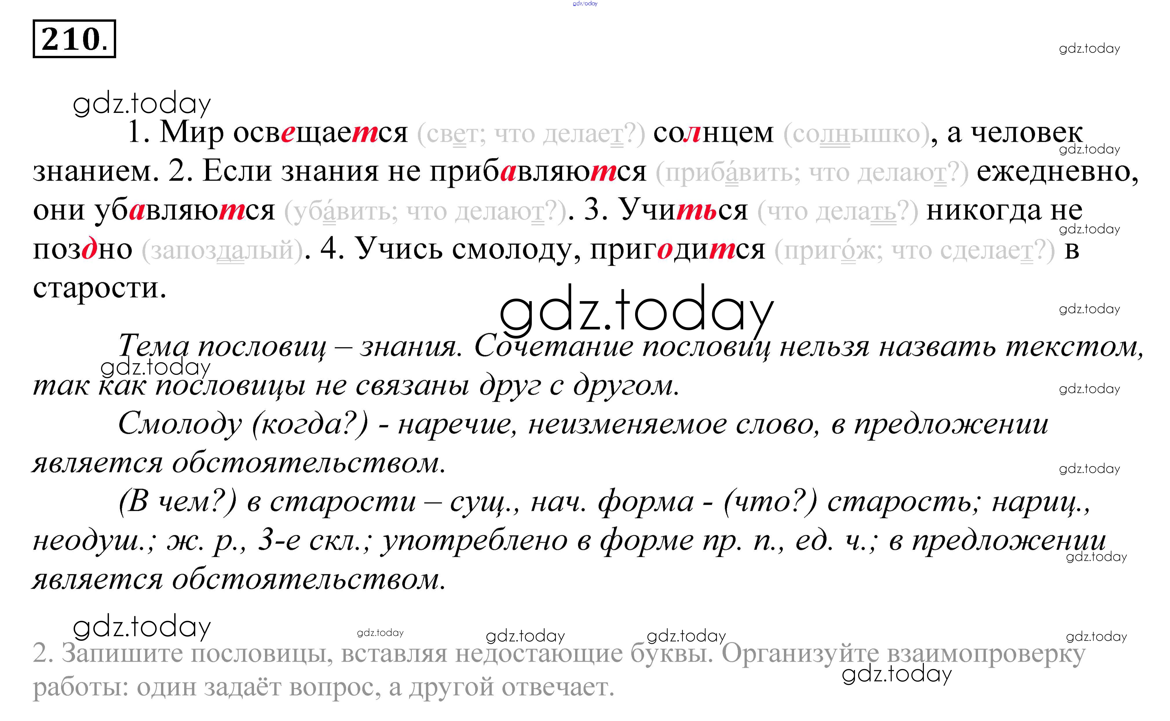 На страницах сайта gdz.today вы найдете учебный и вспомогательный материал, направленный на улучшения знаний школьной программы. ГДЗ - онлайн мир знаний Решение к упражнениям 210 Учебнику по Русскому языку для 5 класса Купалова, Еремеева Дрофа 2015