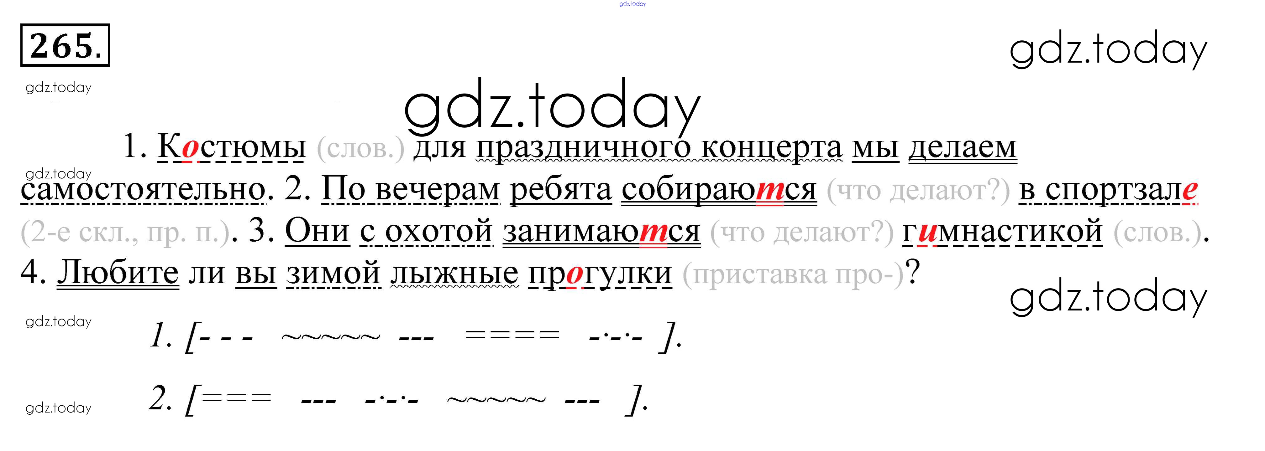 На страницах сайта gdz.today вы найдете учебный и вспомогательный материал, направленный на улучшения знаний школьной программы. ГДЗ - онлайн мир знаний Решение к упражнениям 265 Учебнику по Русскому языку для 5 класса Купалова, Еремеева Дрофа 2015