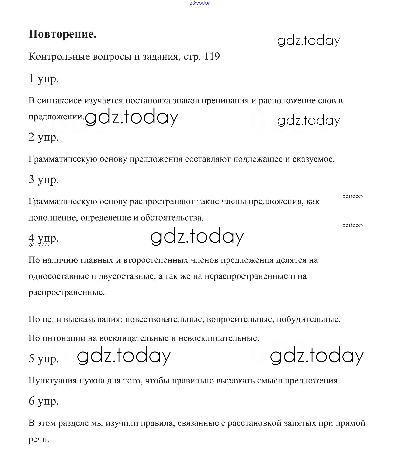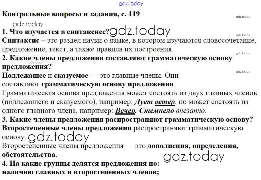 На страницах сайта gdz.today вы найдете учебный и вспомогательный материал, направленный на улучшения знаний школьной программы. ГДЗ - онлайн мир знаний Повторение. Контрольные вопросы и задания Часть 1. Решение к упражнениям стр.119 (131) Учебнику по Русскому языку для 5 класса Баранов, Ладыженская Просвещение, Просвещение 2016, 2019